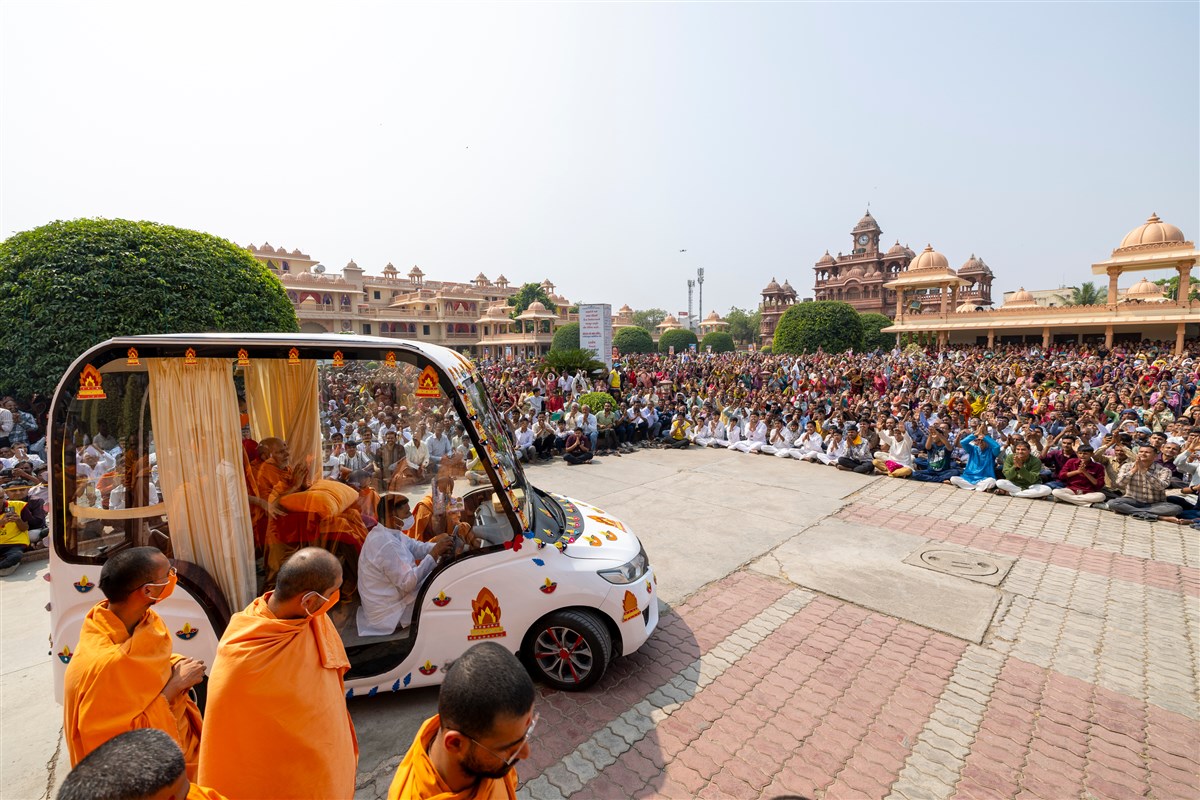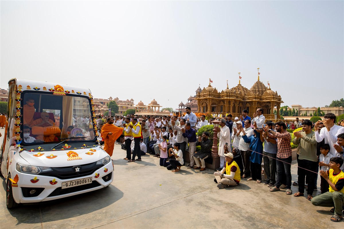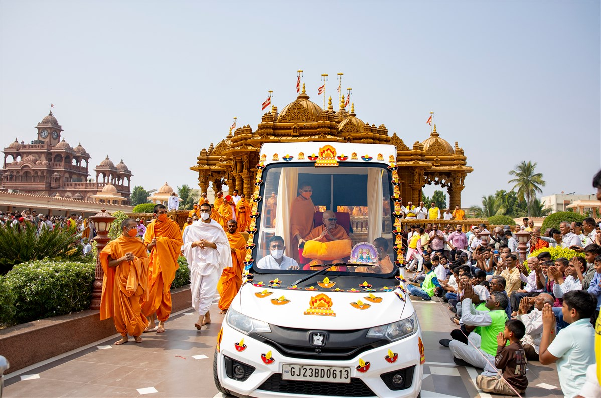 Swamishri arrives at Shri Yogi Smruti Mandir