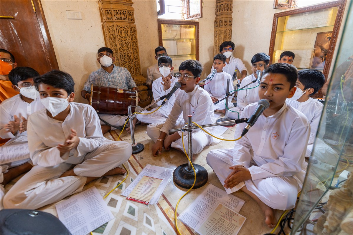 Students of Swaminarayan Vidyamandir, Gondal, sing thals to offer the annakut to Thakorji