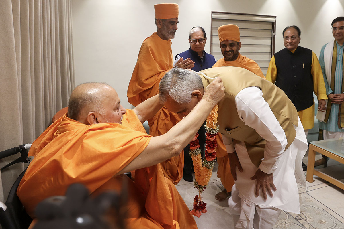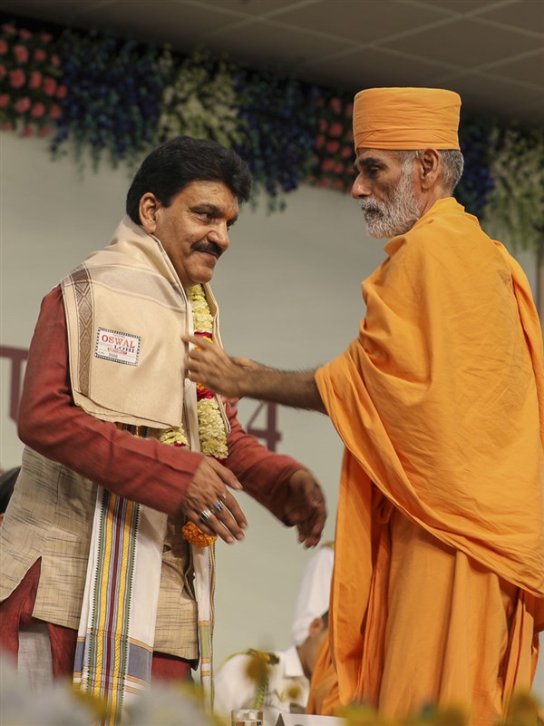 Pujya Ishwarcharan Swami honors Shri Acharya Devvratji with a garland