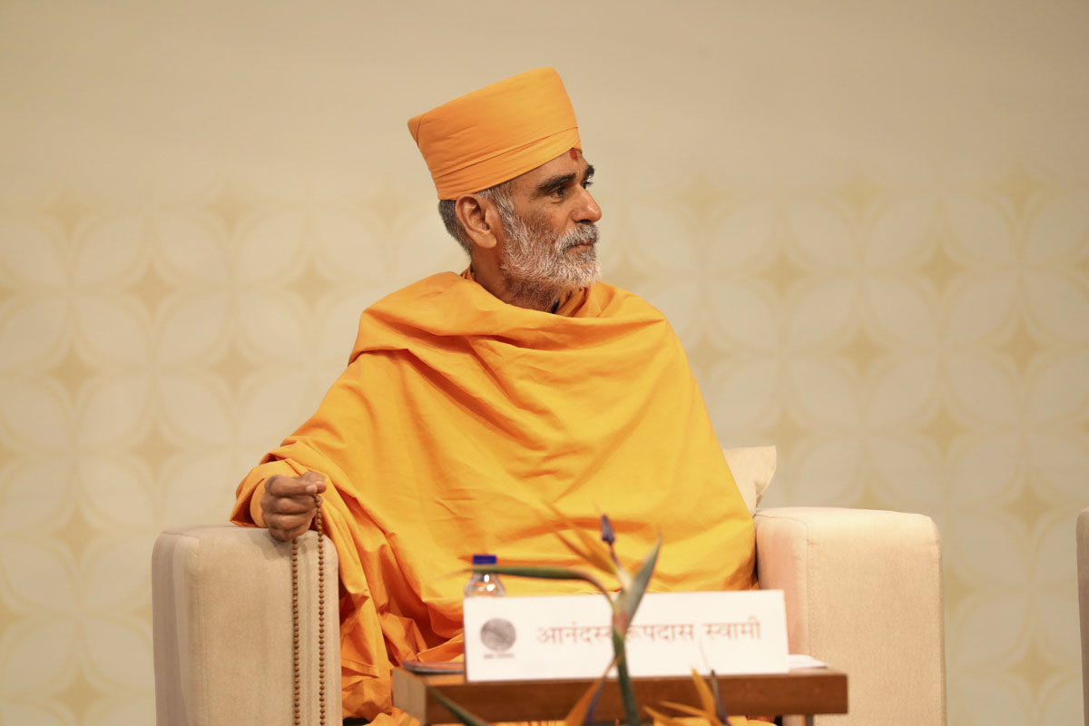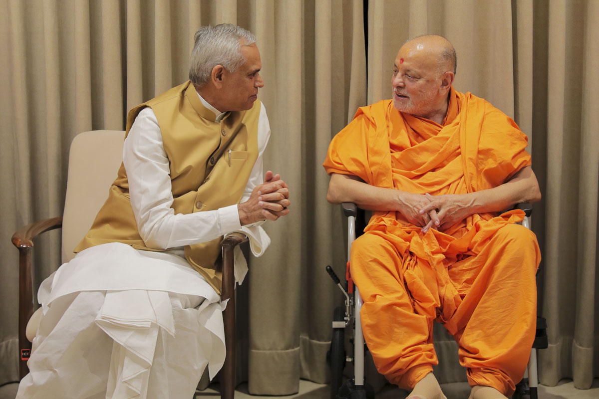 Shri Acharya Devvratji in conversation with Pujya Ishwarcharan Swami