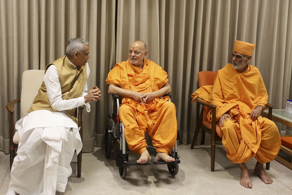 Pujya Ishwarcharan Swami, swamis and dignitaries in conversation with Shri Acharya Devvratji