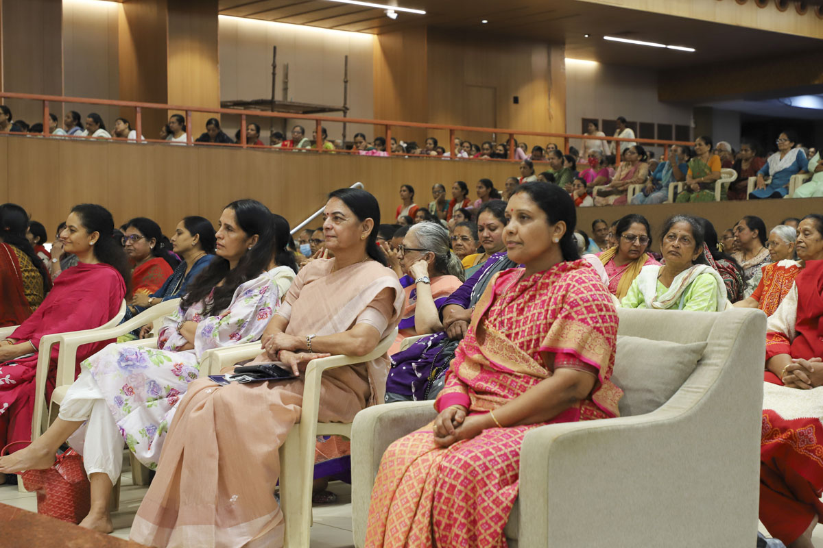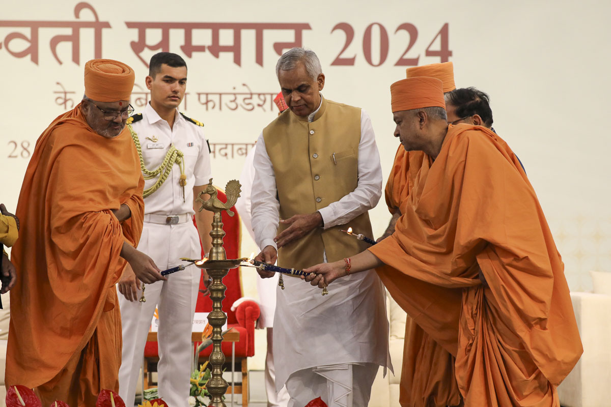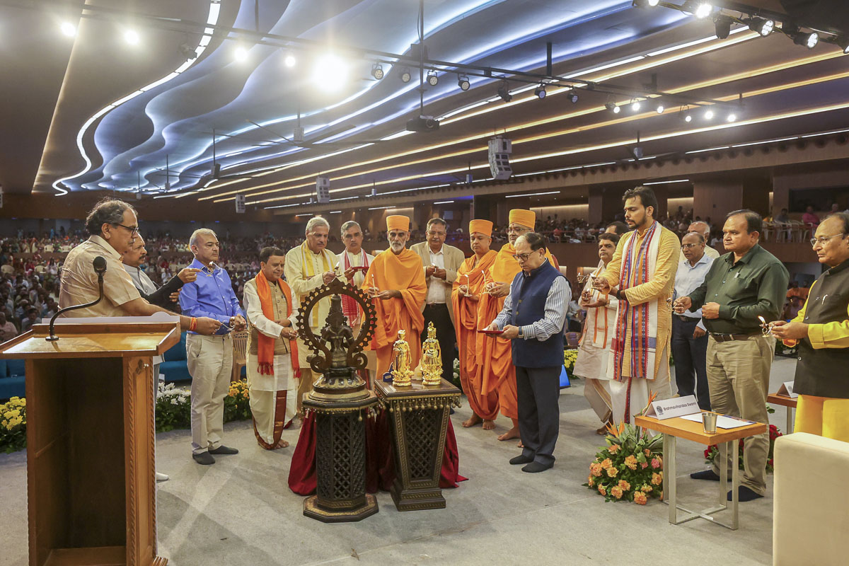 Shri Acharya Devvratji and swamis light the ceremonial lamp
