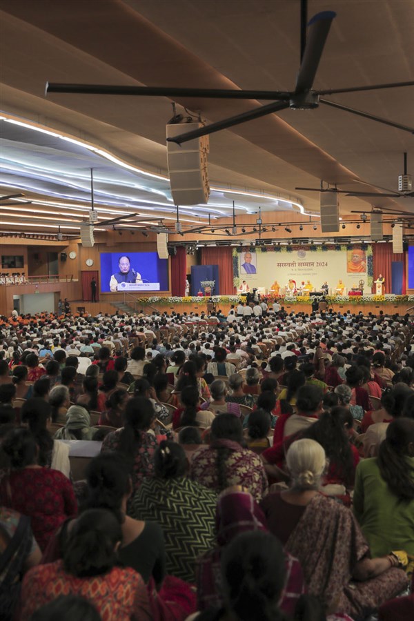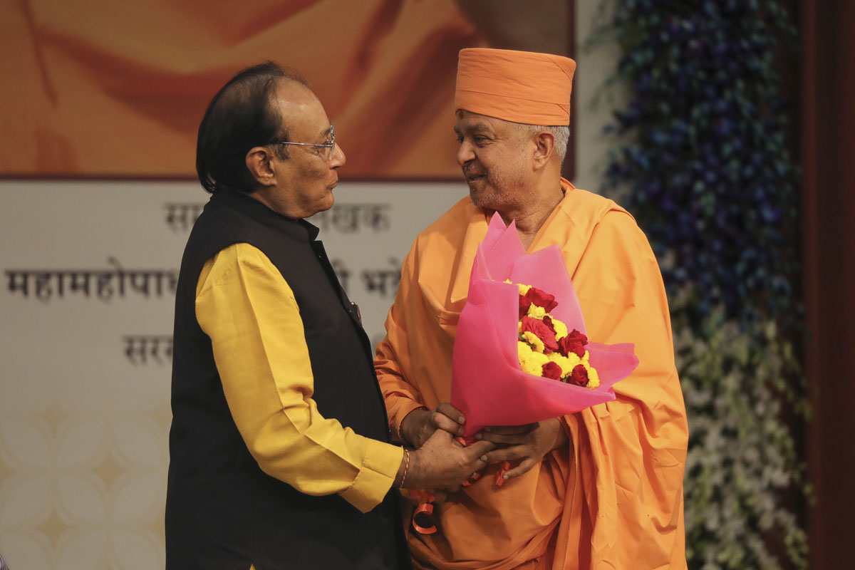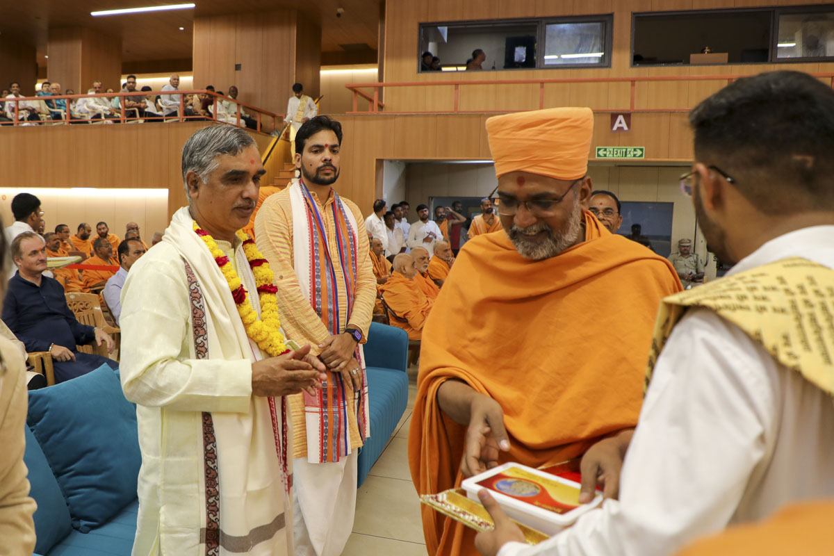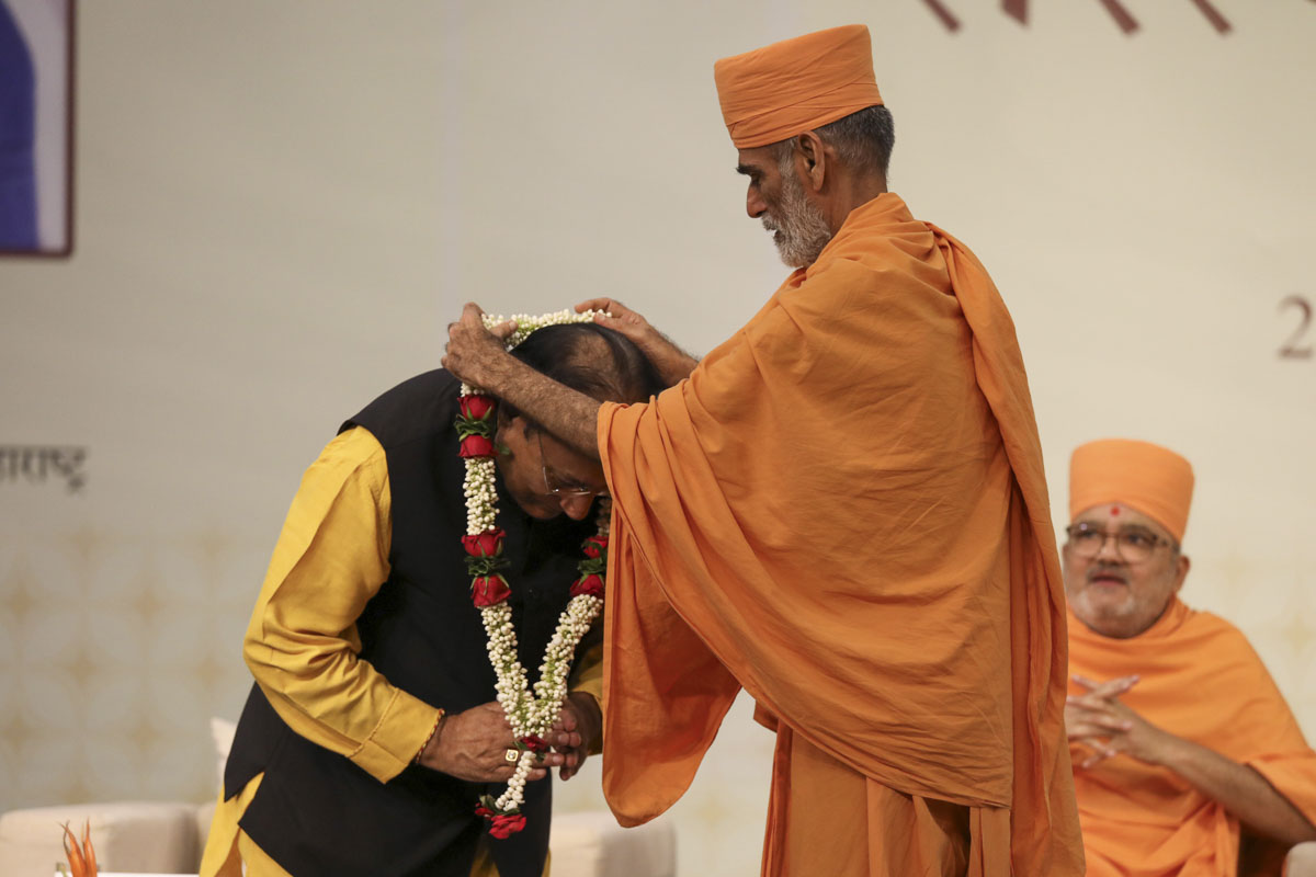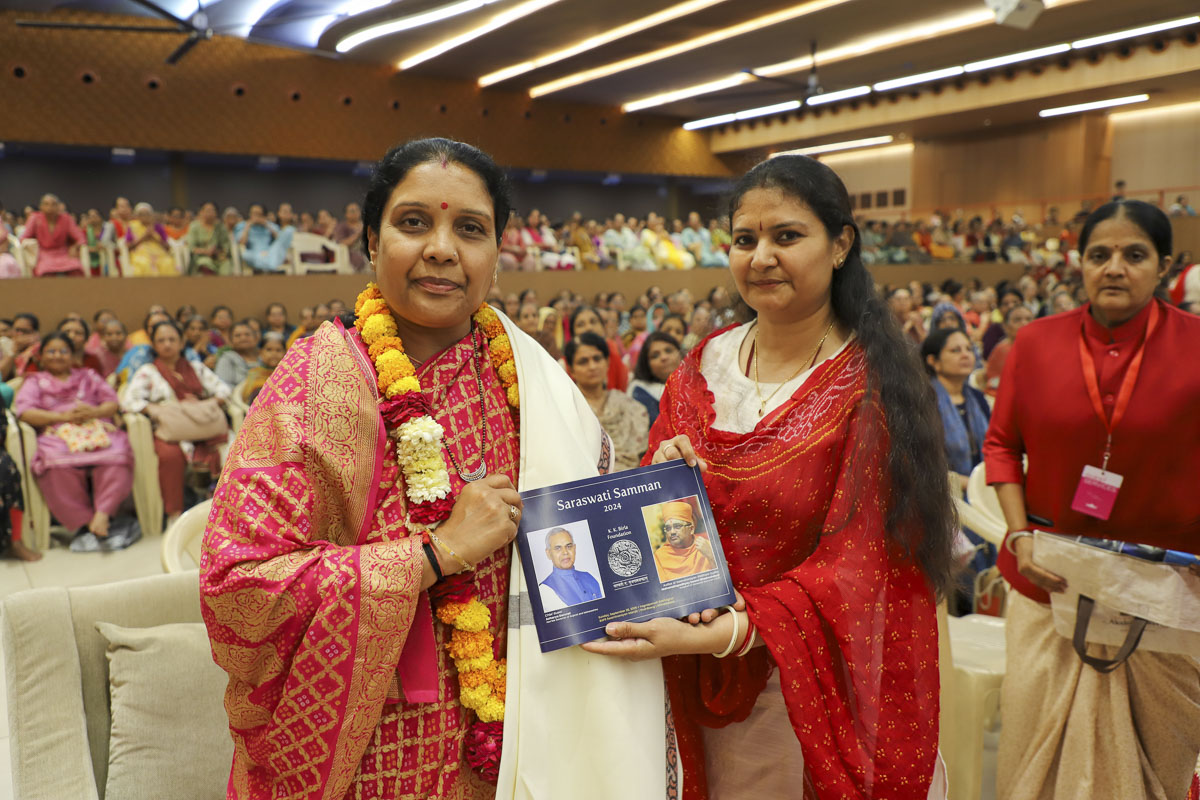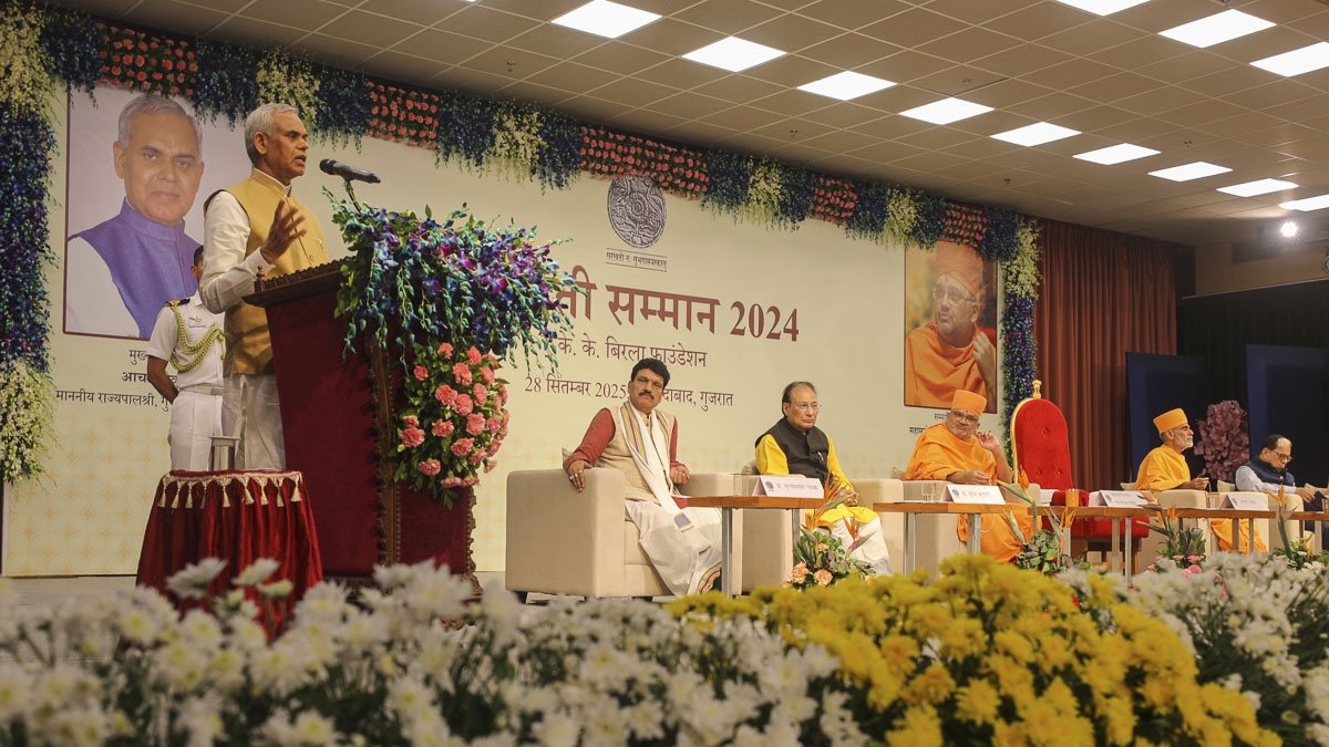 Shri Acharya Devvratji and dignitaries present the Saraswati samman placque to Bhadresh Swami
