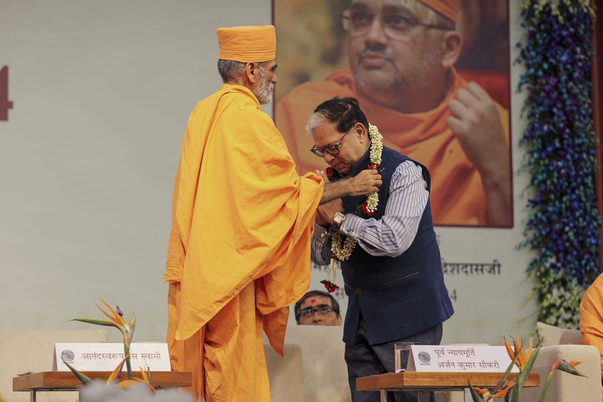 Anandswarup Swami honors Retd. Justice Arjan Kumar Sikari with a garland