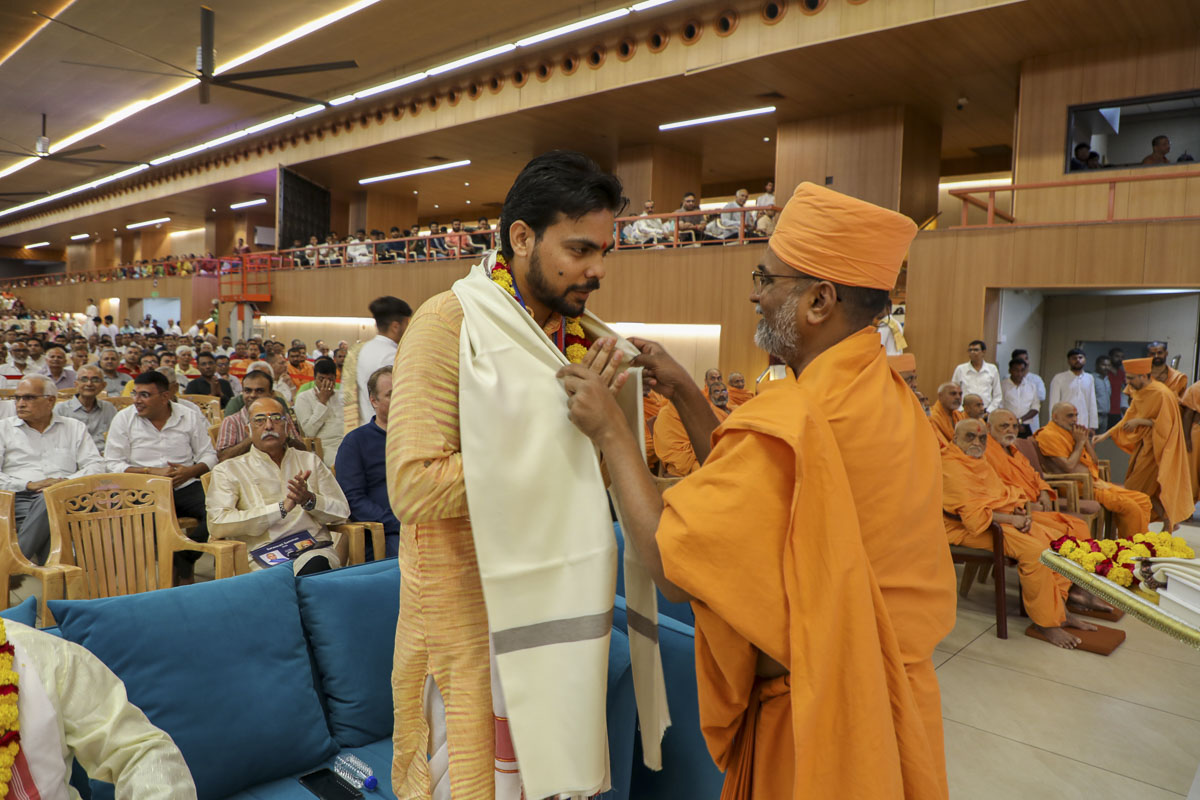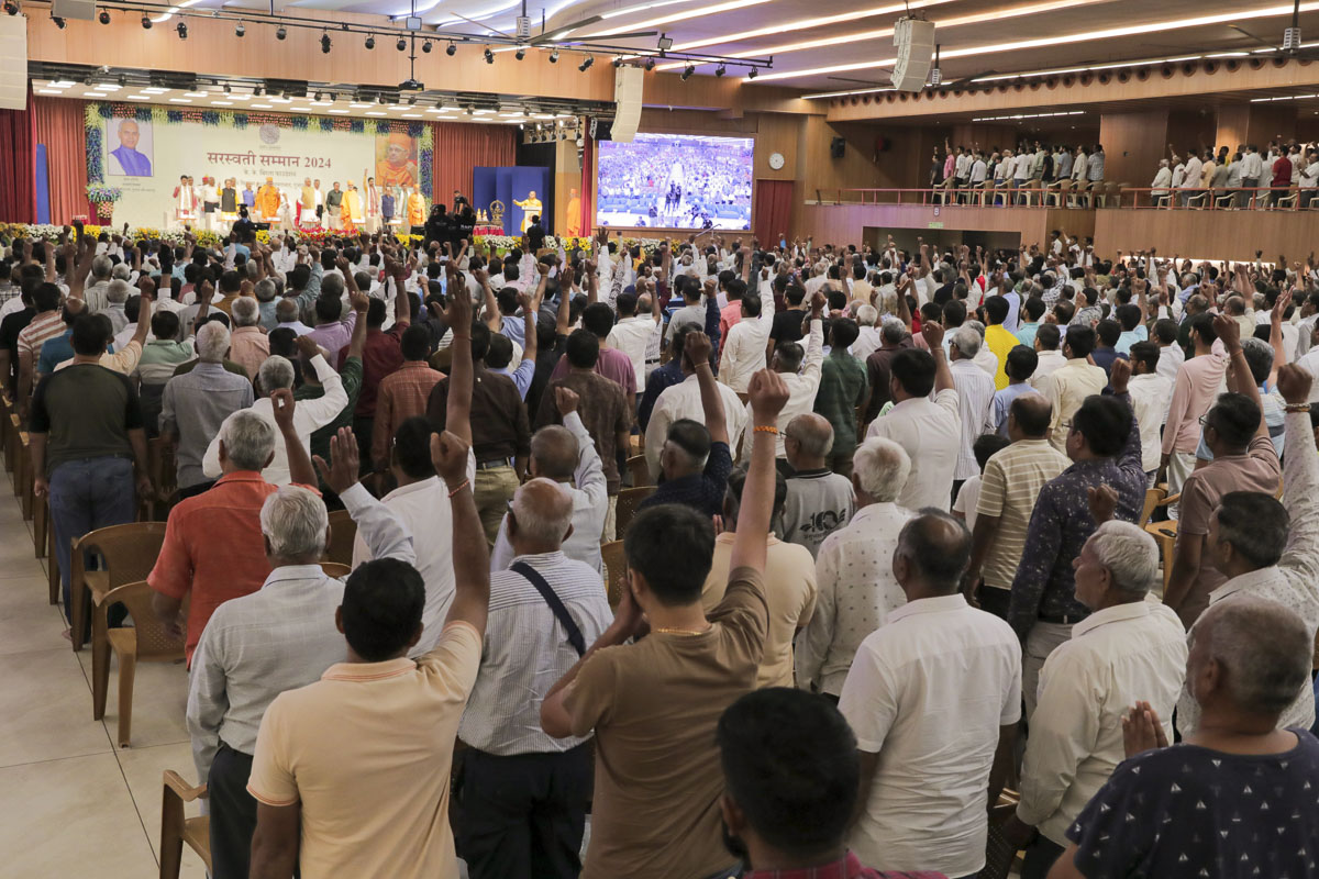Shri Acharya Devvratji and dignitaries present the Saraswati samman certificate to Bhadresh Swami