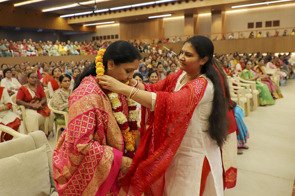 A volunteer of BAPS welcomes Shri Pratibha Jain, Mayor of Ahmedabad, with a garland