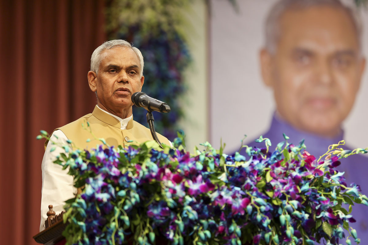 Shri Acharya Devvratji, swamis and dignitaries on the stage during the ceremony