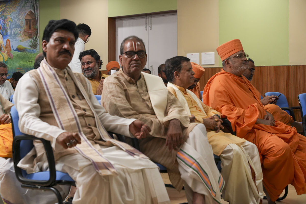 Stage guests receive their photos captured at the Akshar-Purushottam Darshan Mandapam