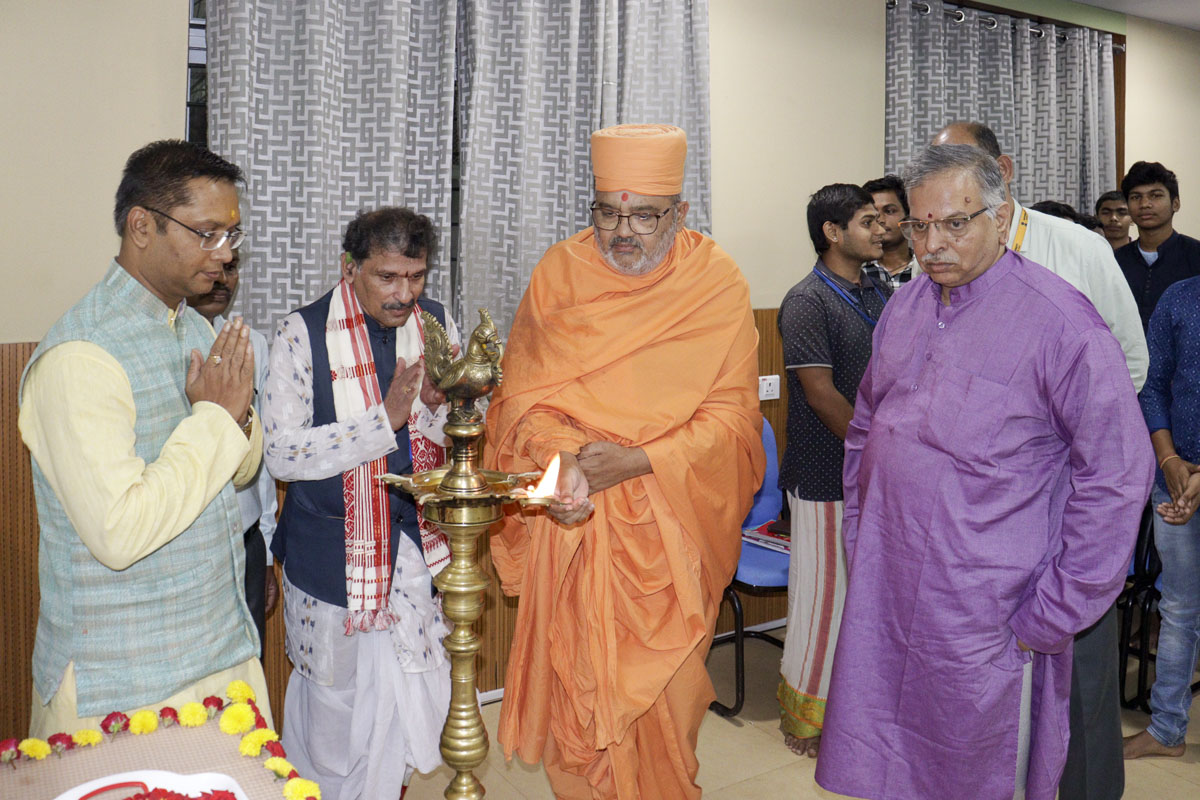 Bhadreshdas Swami and stage guests perform deep-prakatya