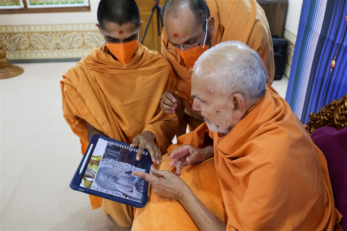 Swamis show Mahant Swami Maharaj the ‘Brahmavidya’ book to be given to the shibir delegates