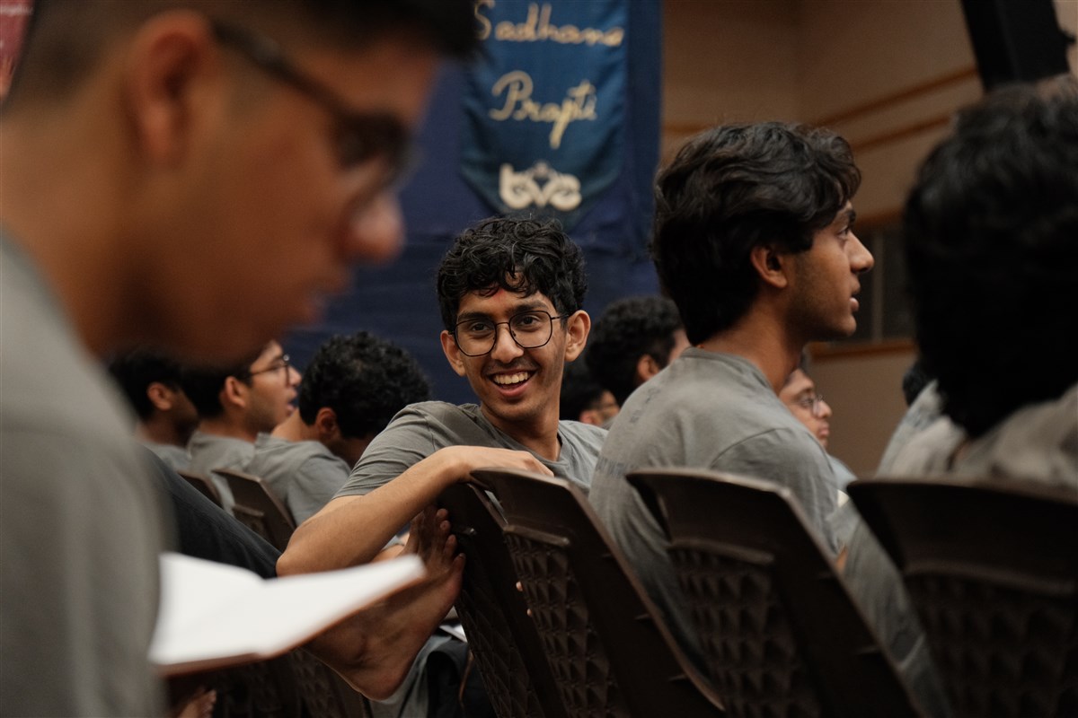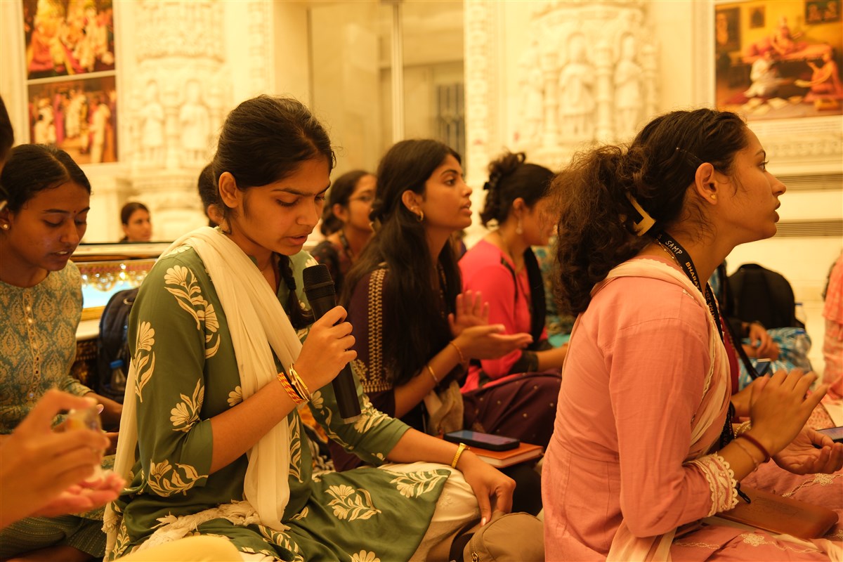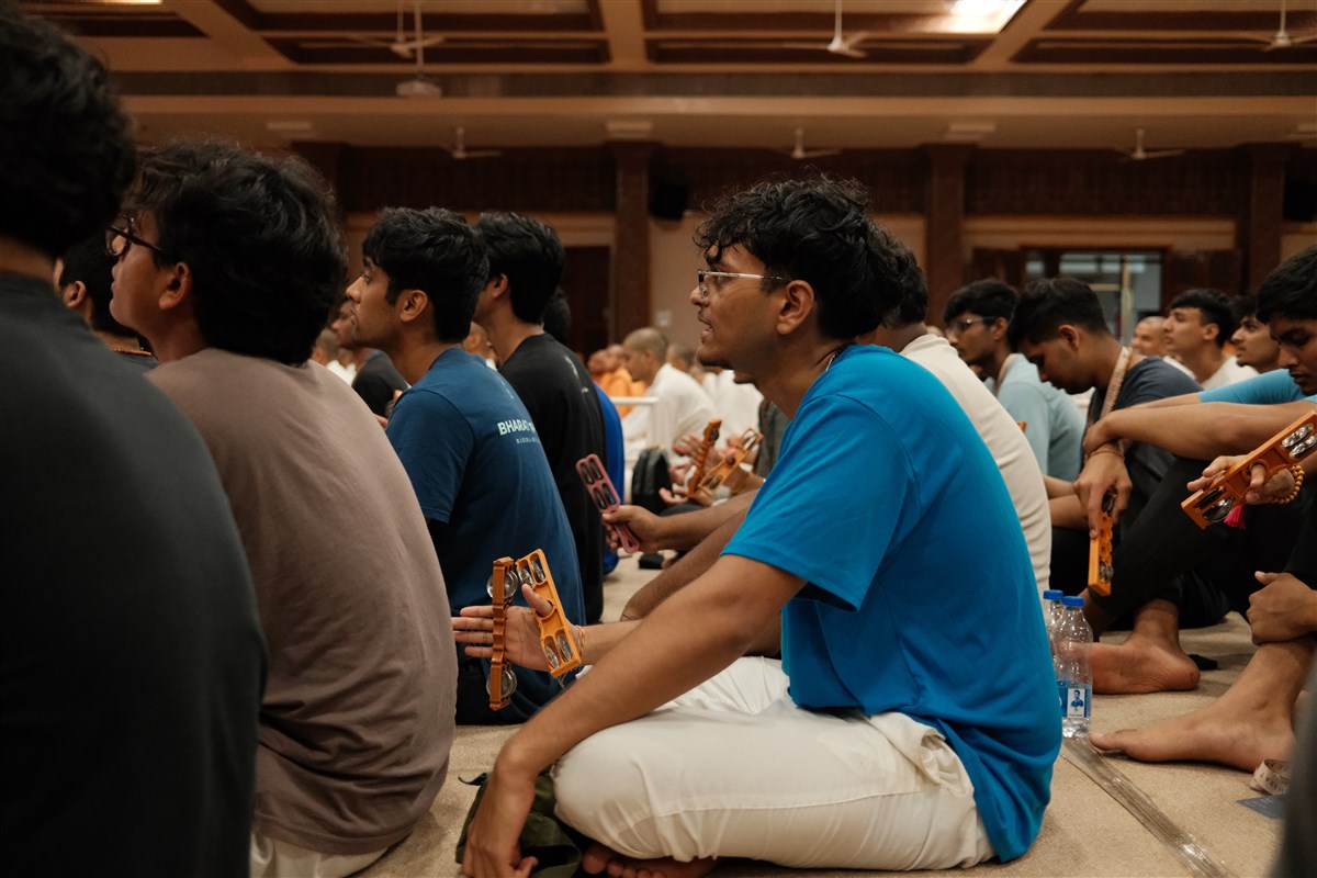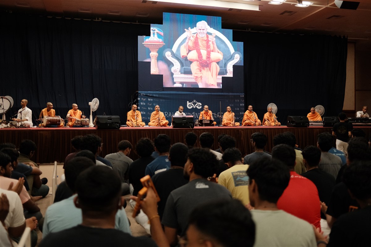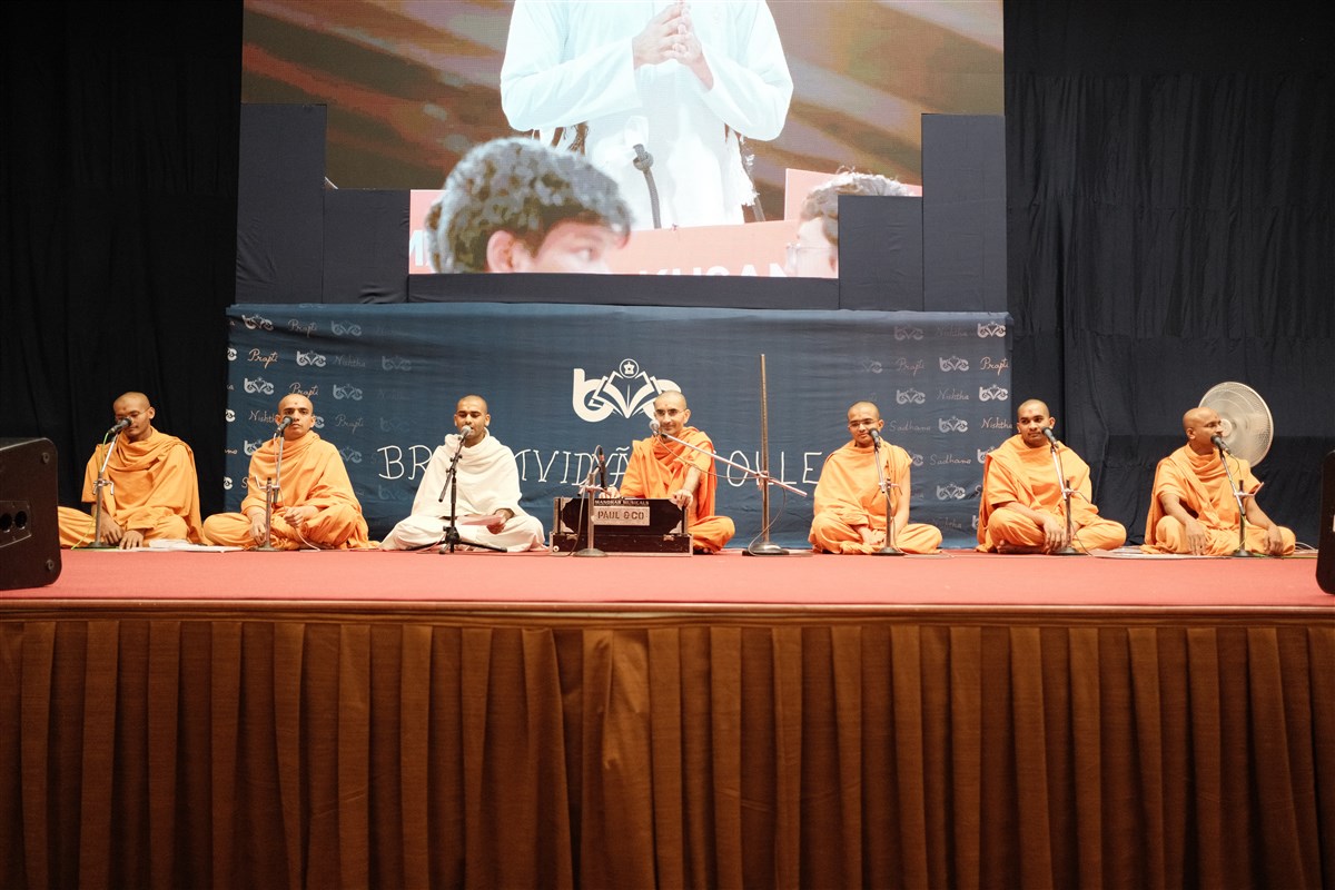 Swamis, parshads and sadhaks sing melodious bhajans outlining the messages and themes of the Brahmavidya College Shibir