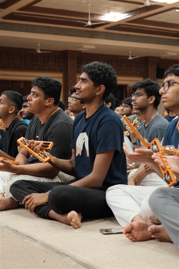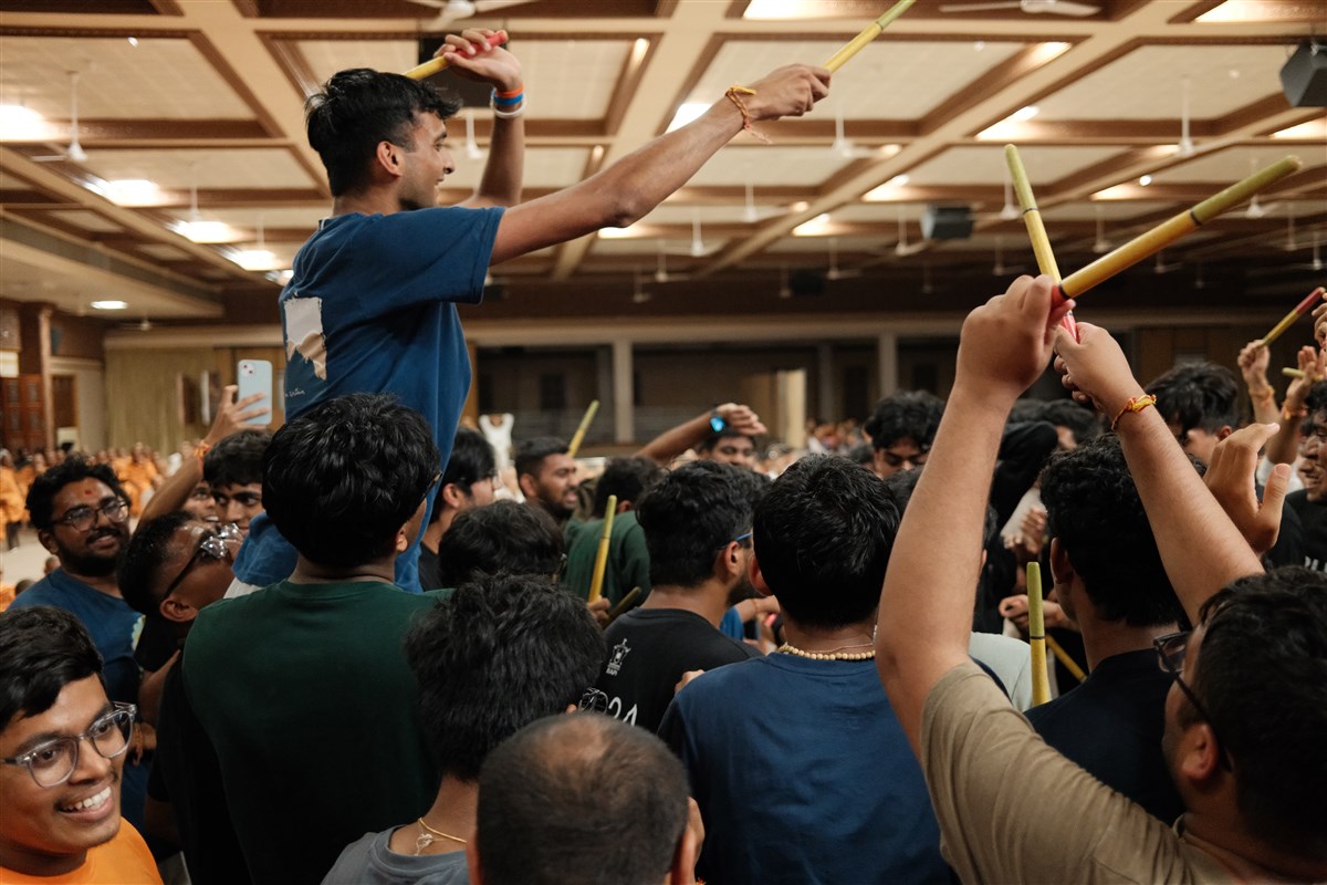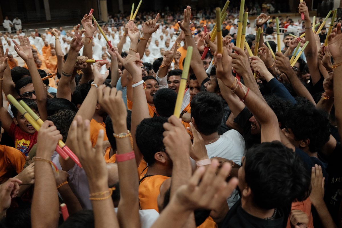 Delegates join along the kirtan aradhana, dancing and playing ‘dandiyas’ to the beat of the bhajans