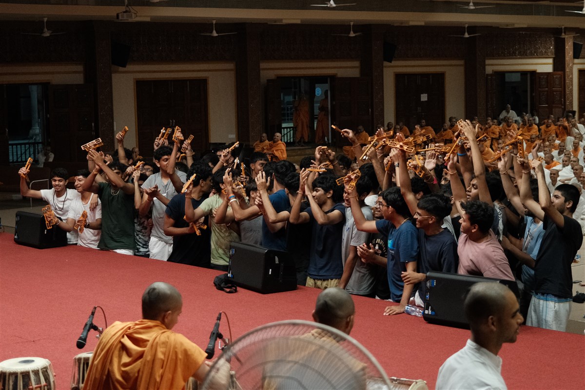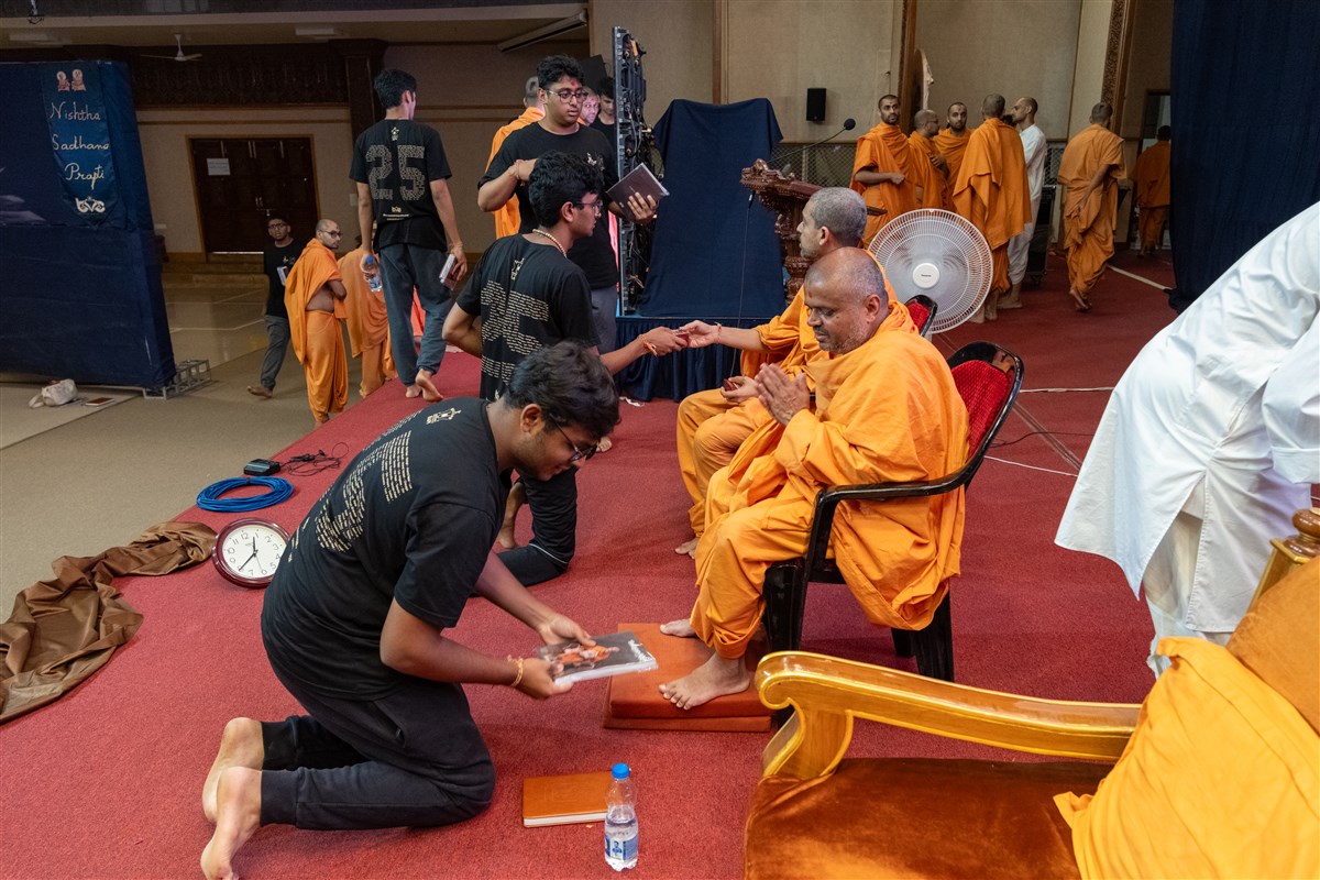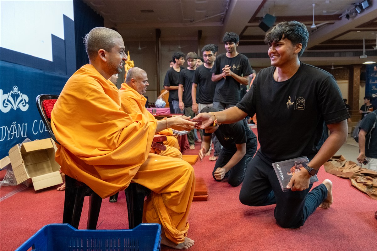 Delegates receive their ‘Brahmvidya’ book from Pujya Ghanshyampriyadas Swami and prasad from Pujya Gnannidhidas Swami