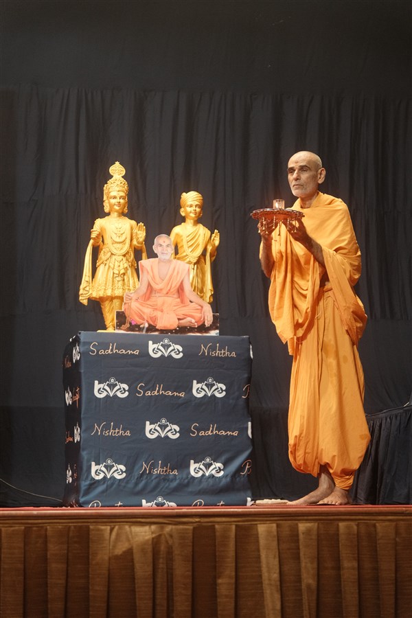 Pujya Anandswarupdas Swami performs arti in the sabha hall with the delegates