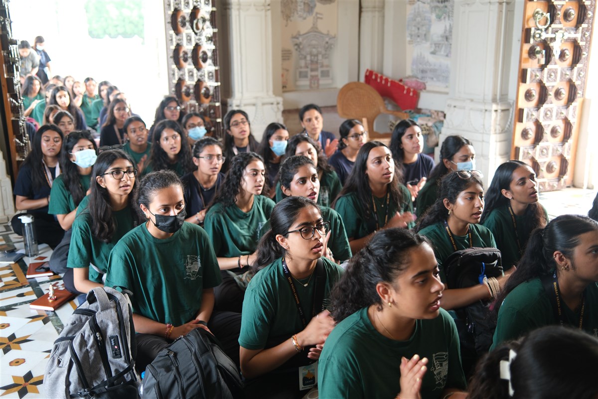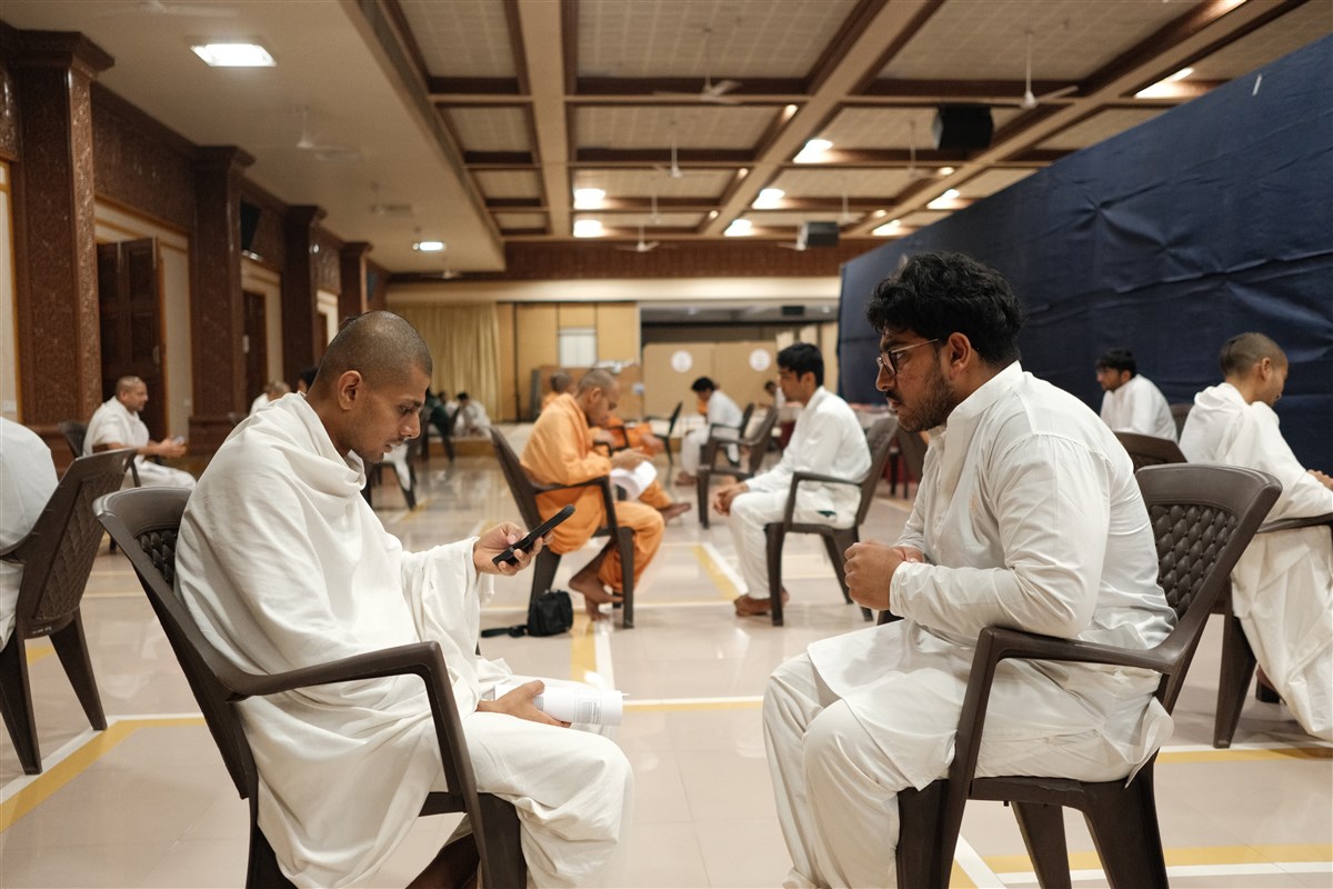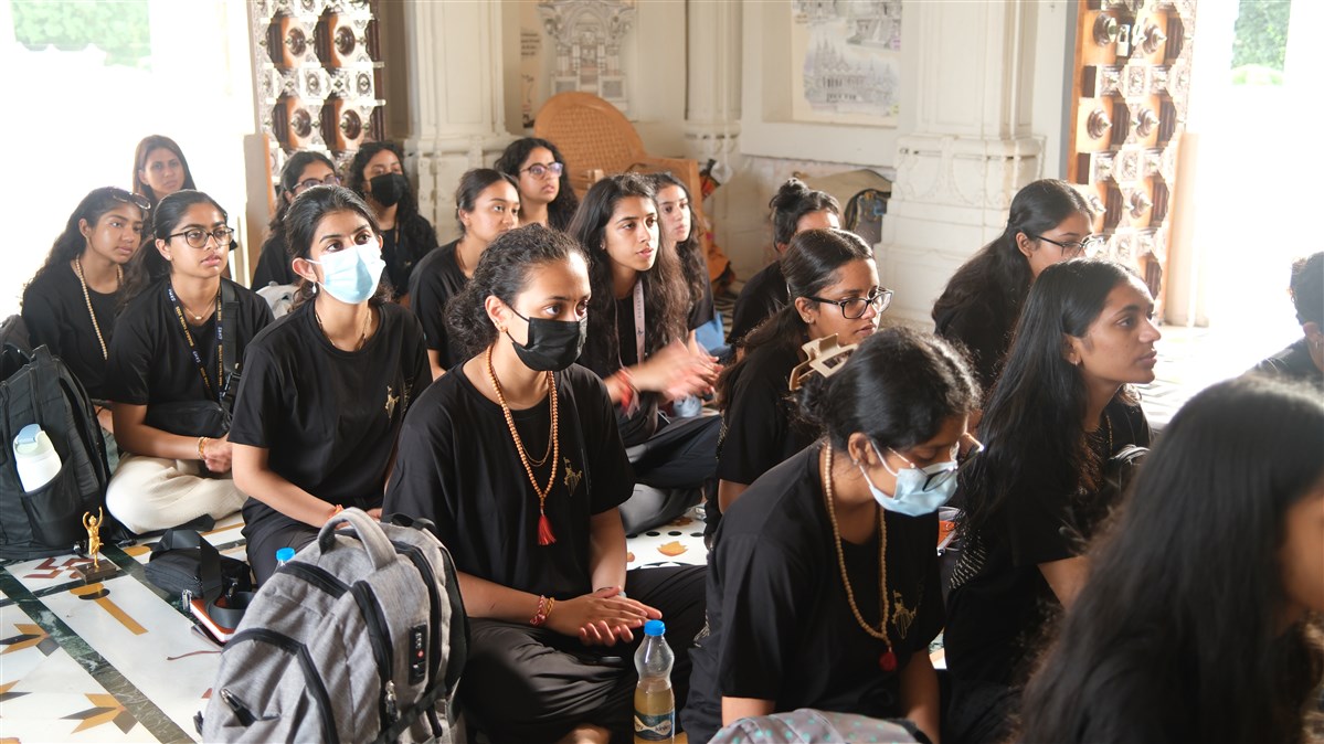 Mahant Swami Maharaj listens to the Brahmavidya College shibir curriculum