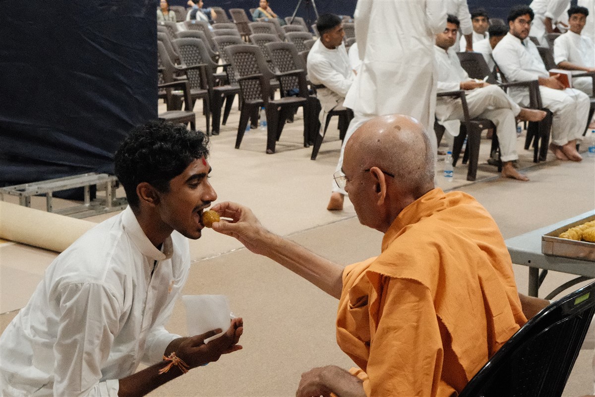 Pujya Aksharcharandas Swami feeds a Motichur Laadu to the delegates to welcome them to the Brahmavidya College shibir as per the wish of Mahant Swami Maharaj