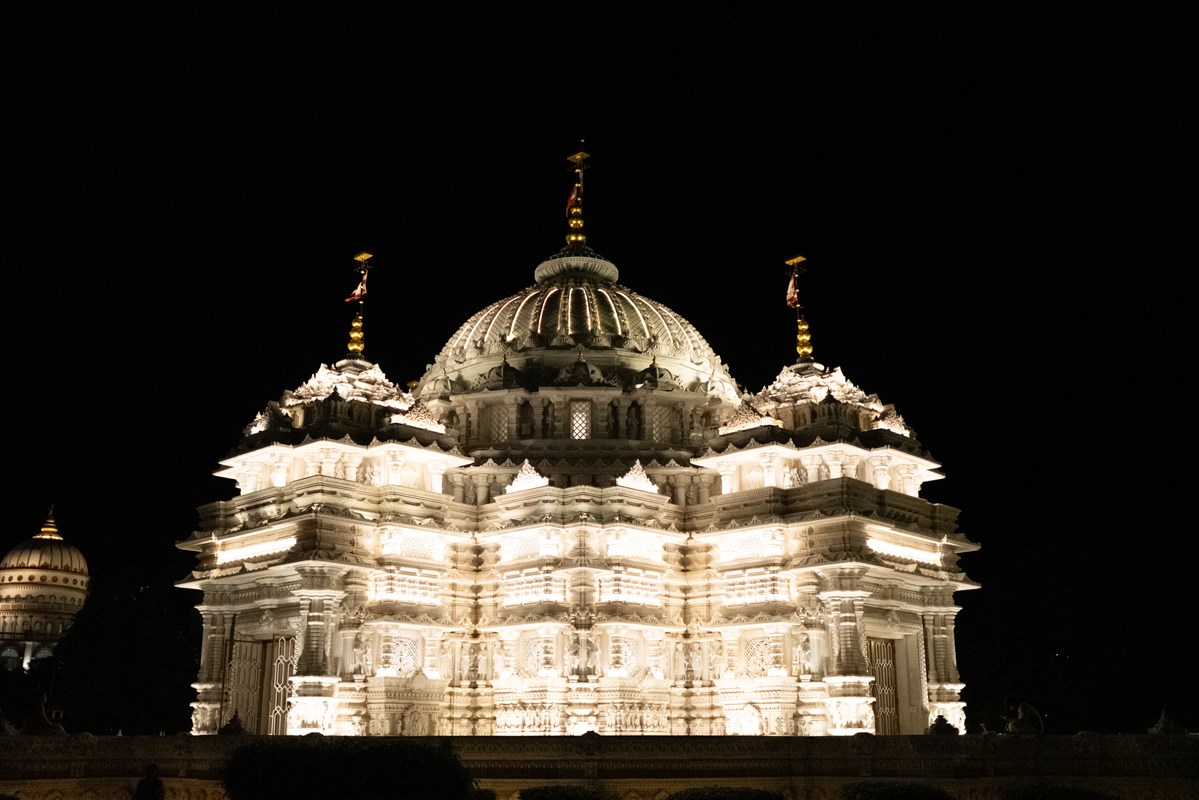BAPS Pramukh Swami Maharaj Smruti Mandir at night