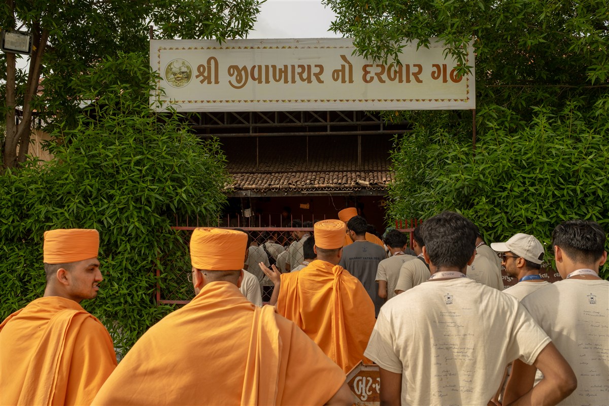 Swamis and Delegates walk to the Darbar of Jiva Khachar where Bhagwan Swaminarayan would reside when he came to Sarangpur