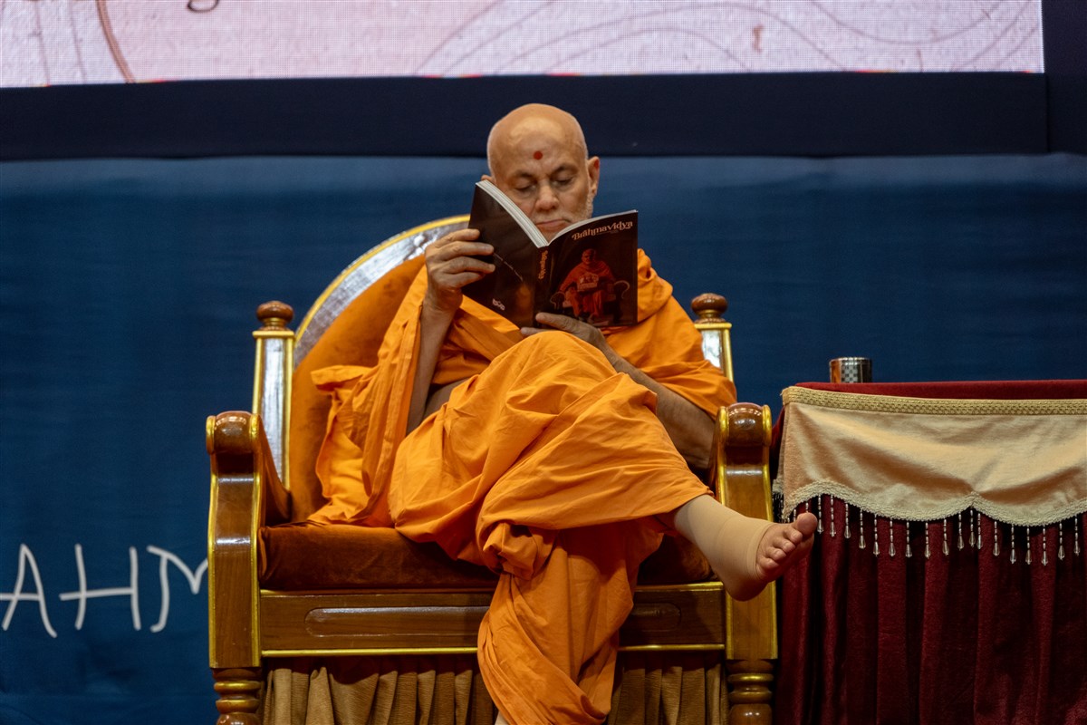Pujya Viveksagardas Swami reads the ‘Brahmavidya’ book received by the delegates