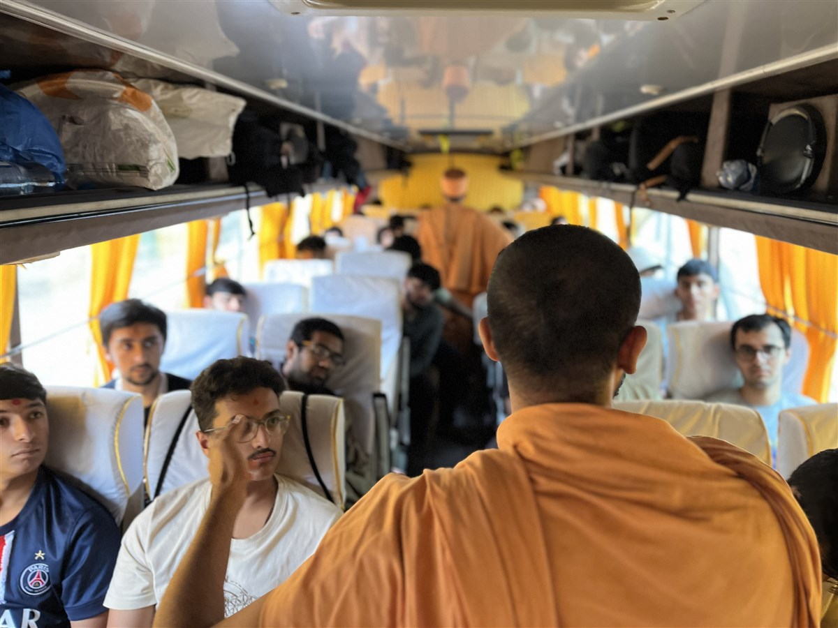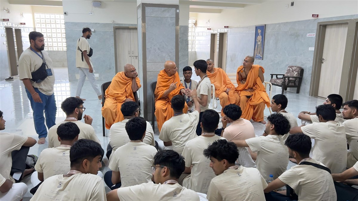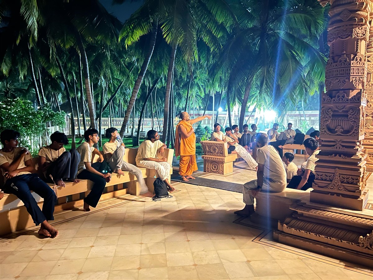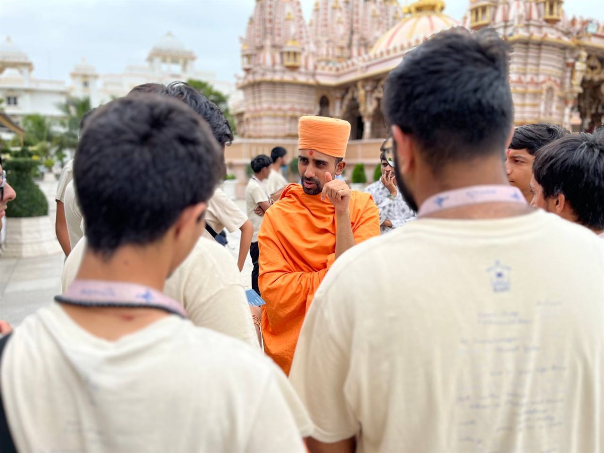Sarvamangal Swami talks to the delegates about the mahima of BAPS Shri Swaminarayan Mandir, Nadiad