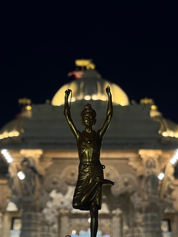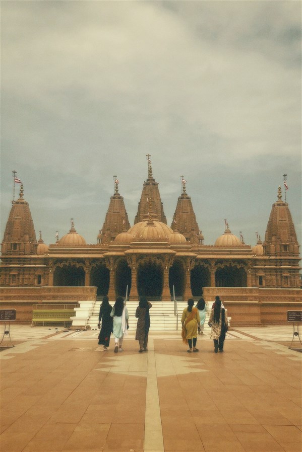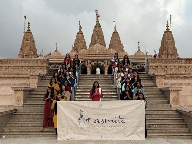 Group photo outside BAPS Shri Swaminarayan Mandir, Mahelav