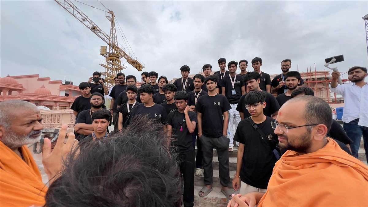 Swamis explain the mahima of Shri Swaminarayan Mandir, Dholera, to the delegates