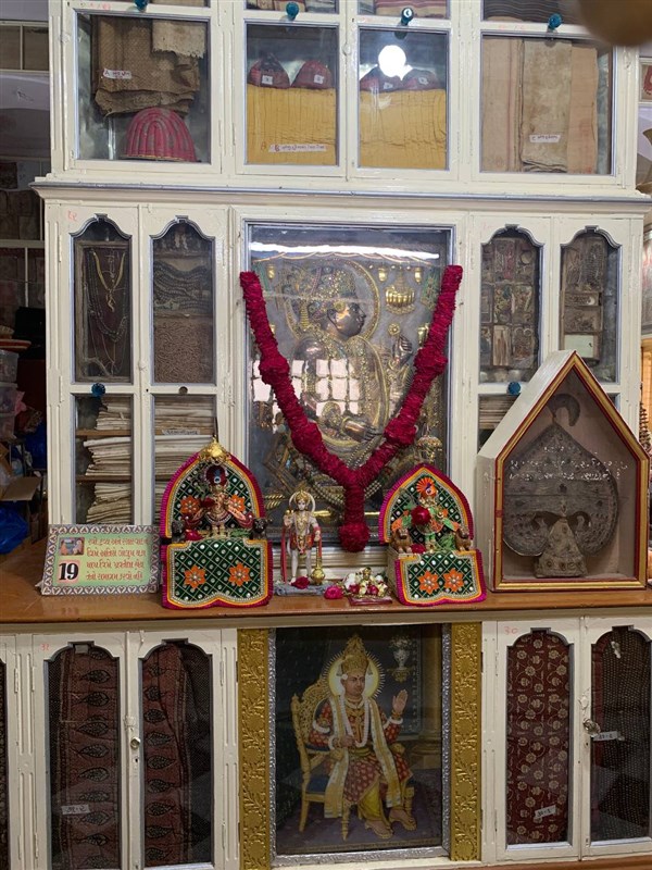 Display at Shri Swaminarayan Mandir, Vartal, showing items sanctified by Bhagwan Swaminarayan