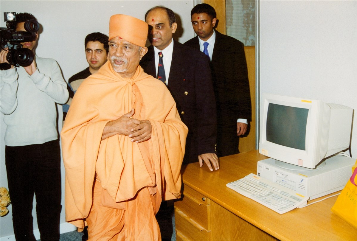 Brahmaswarup Pramukh Swami Maharaj conversing with devotees in Loughborough