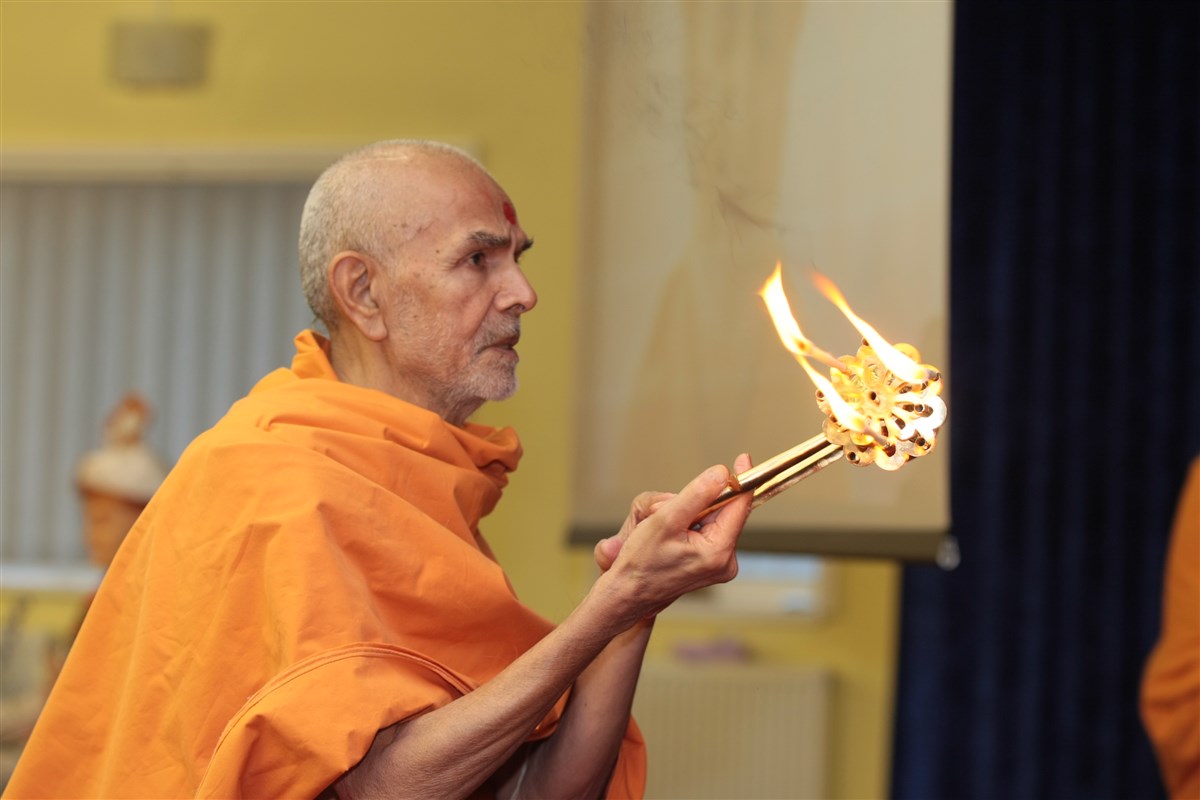 Sadguru Pujya Mahant Swami performing the arti at Loughborough Mandir on 11 September 2015