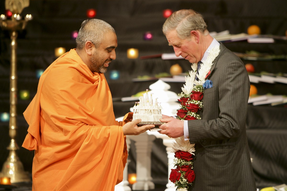 Yogvivekdas Swami presented HM The King, then HRH The Prince of Wales, with a memento during his visit to the Mandir at Diwali in 2007