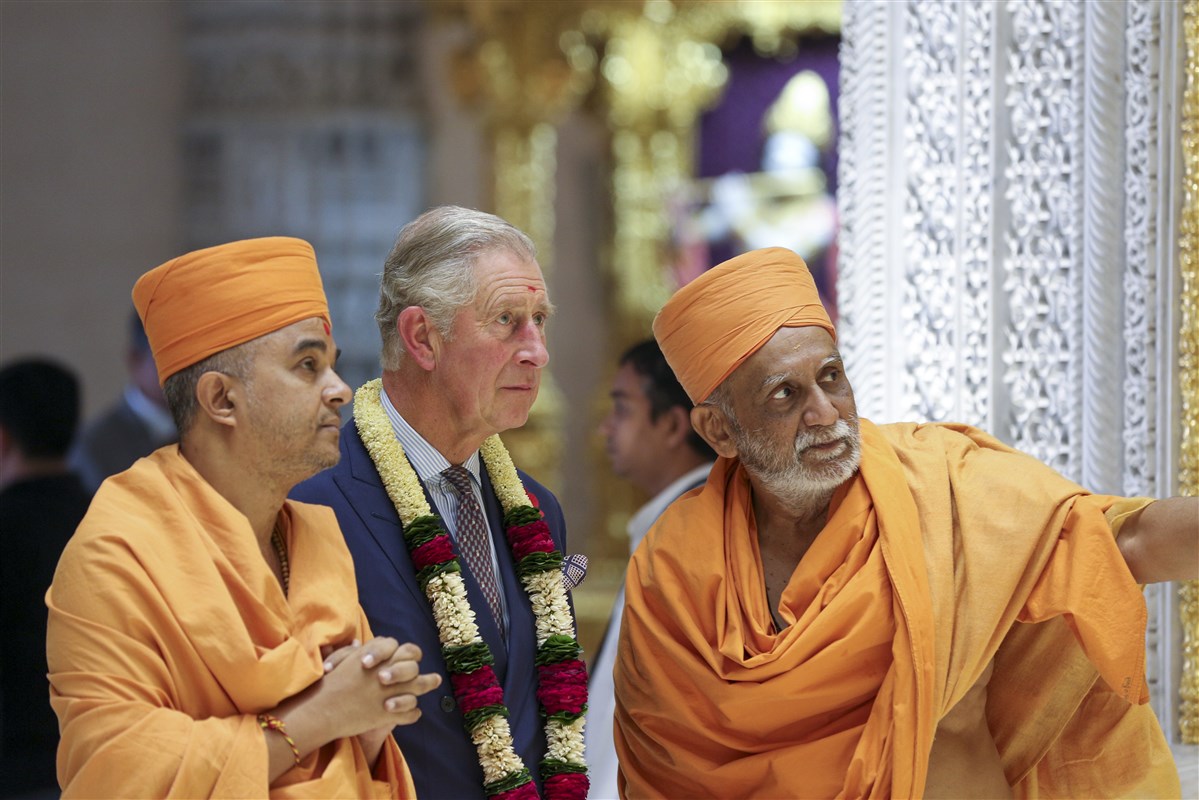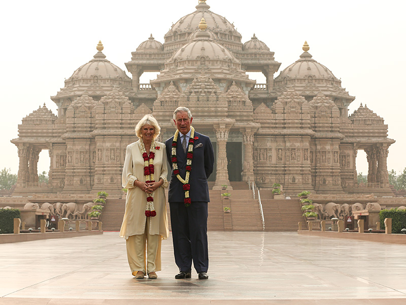 HM The King, then HRH Prince Charles, at Swaminarayan Akshardham in New Delhi, India, in 2013