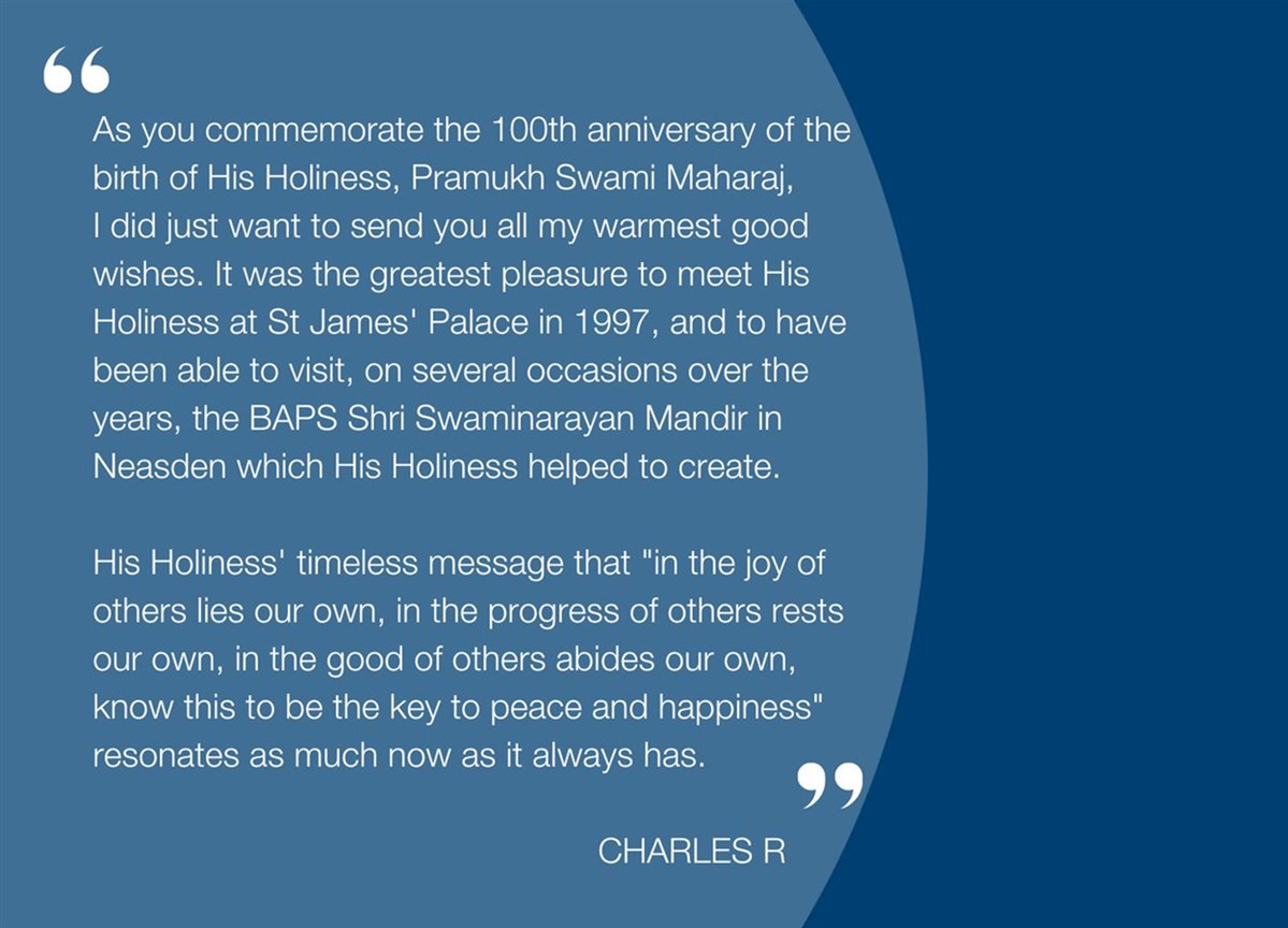 HM King Charles III sent a personal message in tribute to Pramukh Swami Maharaj on the occasion of his centennial celebrations in India, in 2022