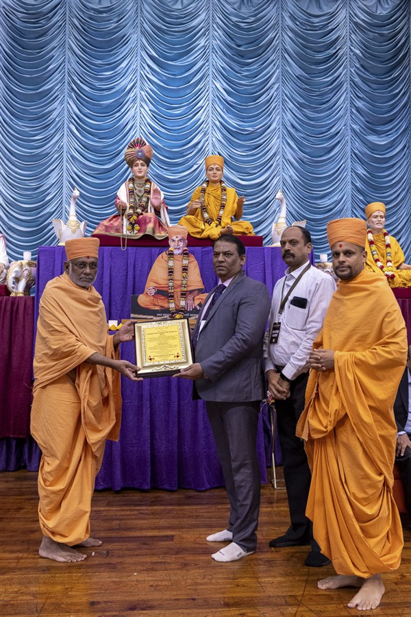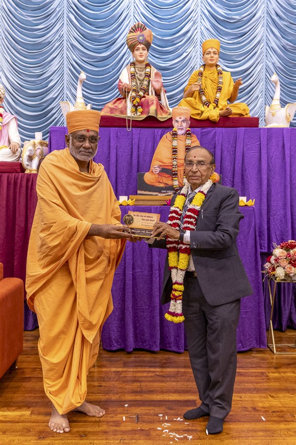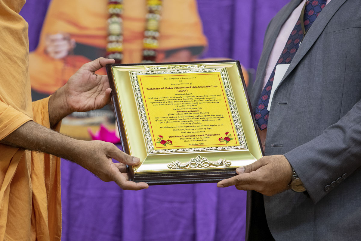 Dr Hitesh Pagare, Deputy Medical Officer, Government of Maharashtra and representative of SBTC, presented the certificate of appreciation to Pujya Abhayswarupdas Swami along with Pujya Prasannamuni Swami