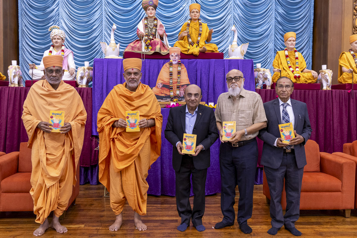 Pujya Abhayswarupdas Swami, Pujya Gnanvatsal Swami and the panel of distinguished doctors releasing the book Inspired: Daily Wisdom for Holistic Living