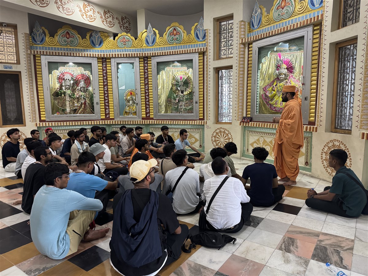 Delegates learn about the history behind the murtis of Shri Akshar-Purushottam Maharaj in the Bharat Mata Mandir in Haridwar