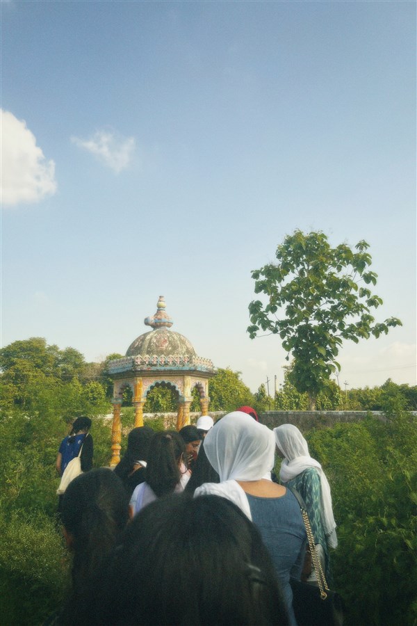 Group photo outside memorial built above the birthplace of Bhagwan Swaminarayan in Chhapaiya