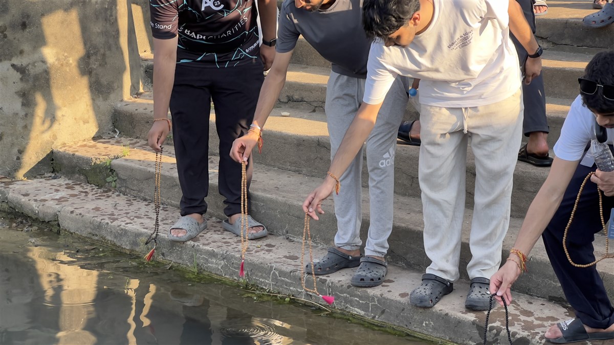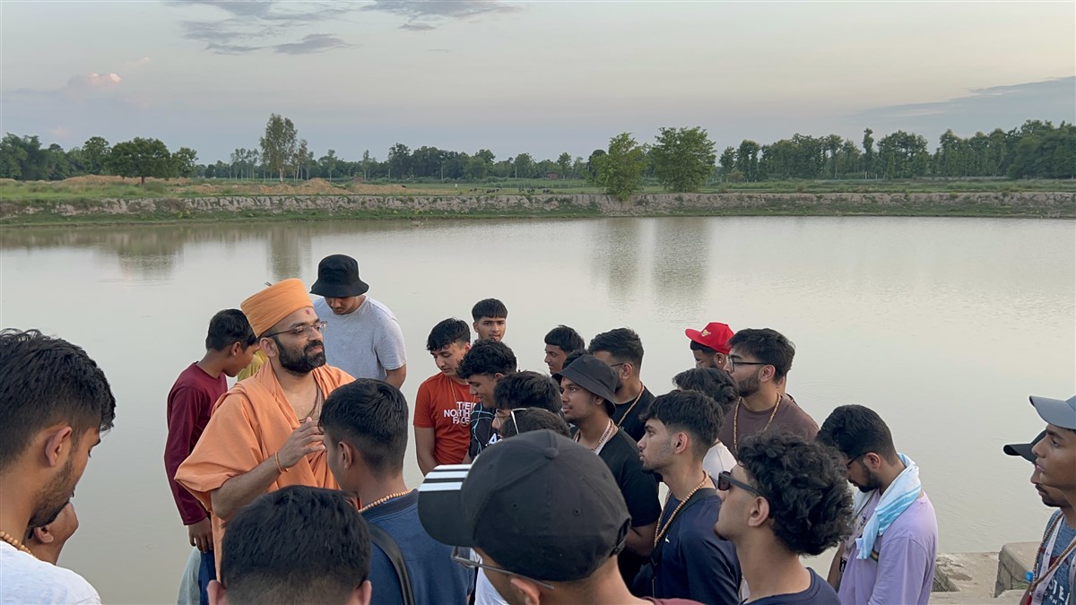Delegates visit the Gau Ghat, where Ghanshyam brought forth the waters of the Ganga from his toe, in Chhapaiya
