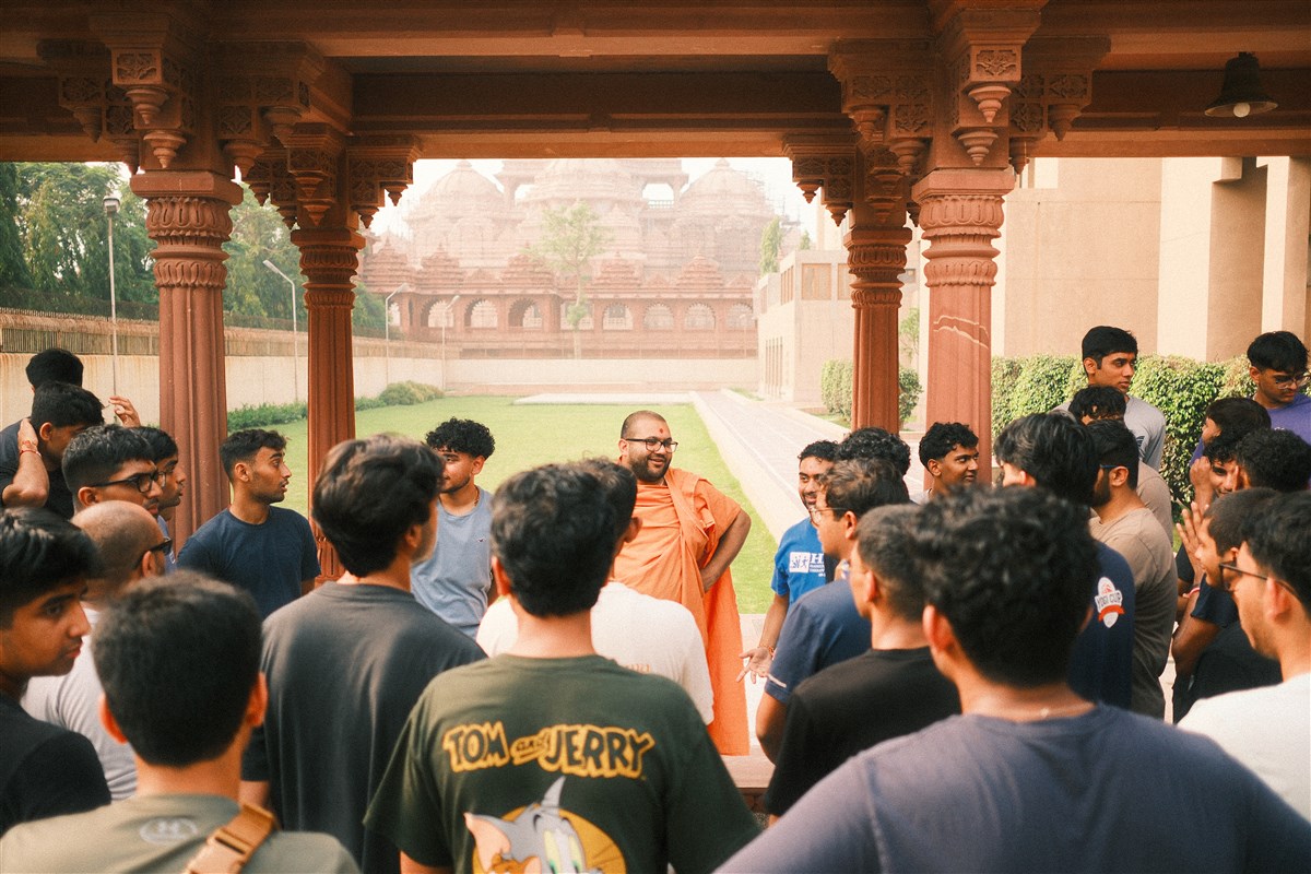 Delegates gather around a swami in the courtyard of Swaminarayan Akshardham, New Delhi, listening attentively as he shares guidance and inspiration