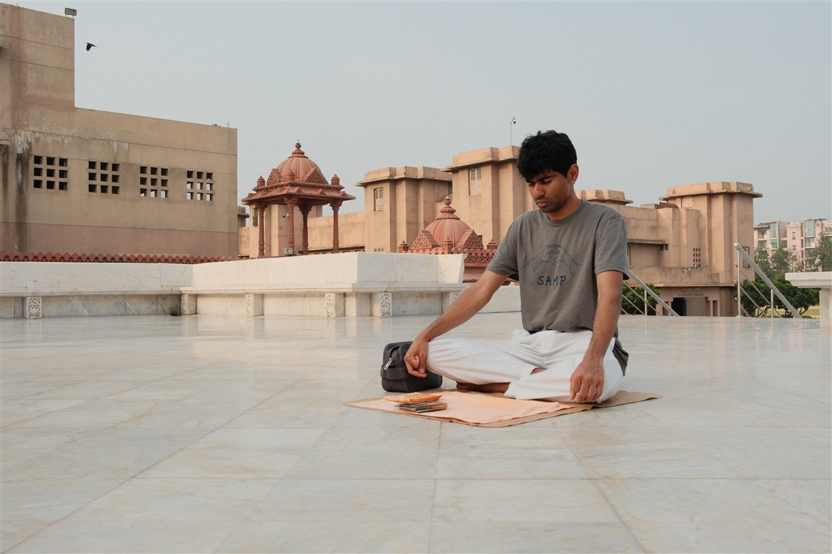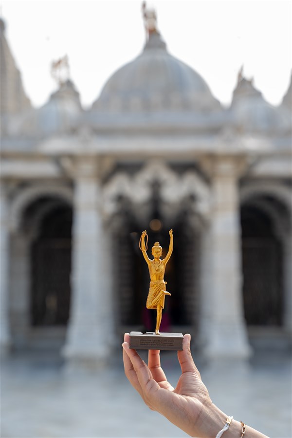 A delegate holds the murti of Shri Nilkanth Varni in front of the BAPS Shri Swaminarayan Mandir, New Delhi. Throughout the journey, delegates expressed their devotion through daily offerings and care of the murti