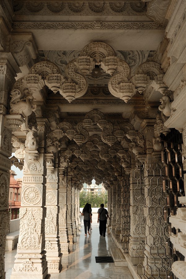 Delegates walk beneath the carved arches of the Shri Swaminarayan Shikharbaddh Mandir, New Delhi