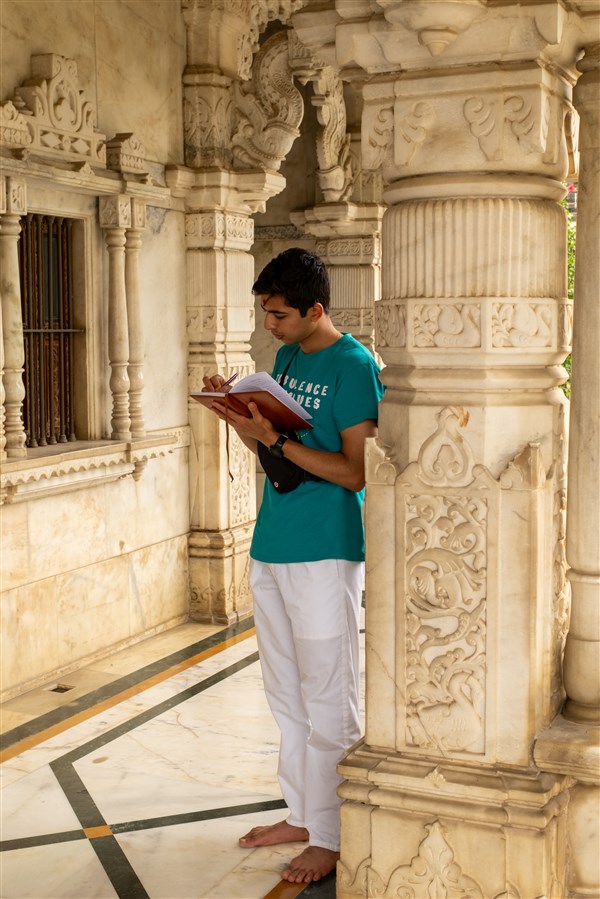 A delegate takes notes on the history and significance of the Swaminarayan Mandir in Chhapaiya