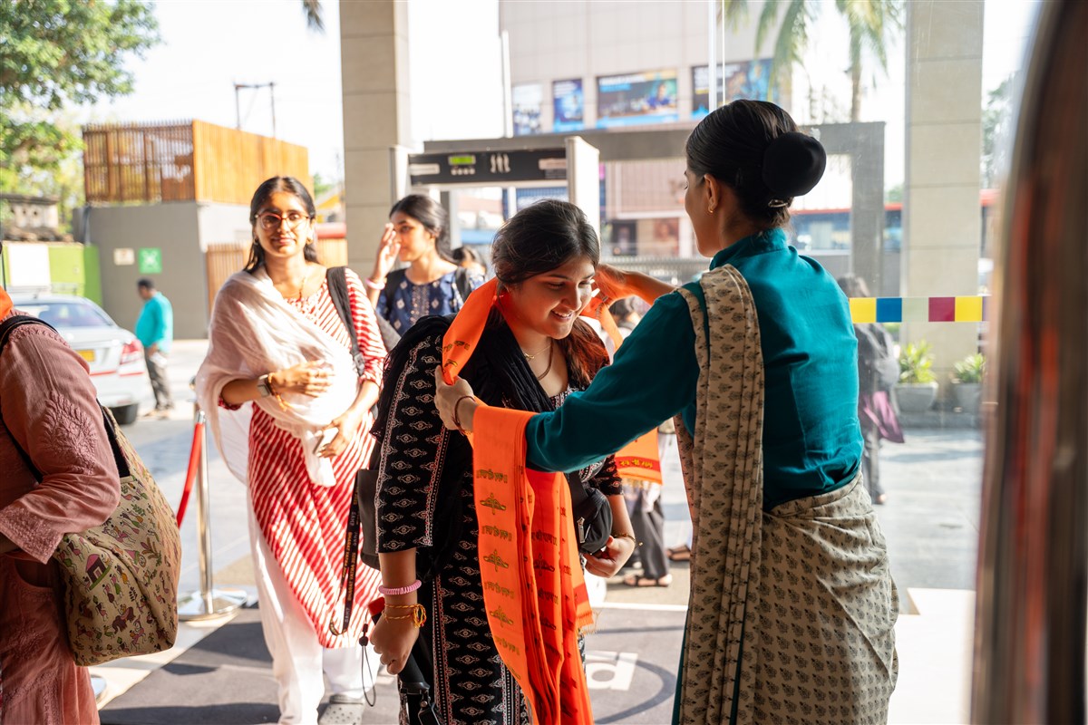 Delegates are offered a traditional welcome by the hotel staff in Ayodhya