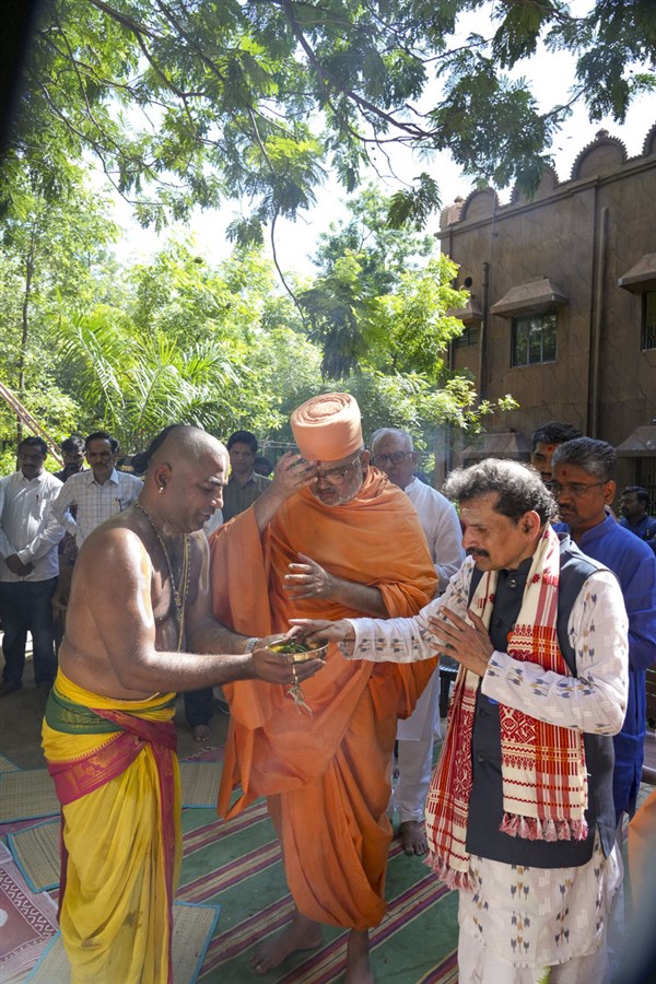 Bhadreshdas Swami and Prof. G. S. R. Krishna Murthy, Honorable Vice-Chancellor of NSU, Tirupati, perform the Parmatmik Yaga