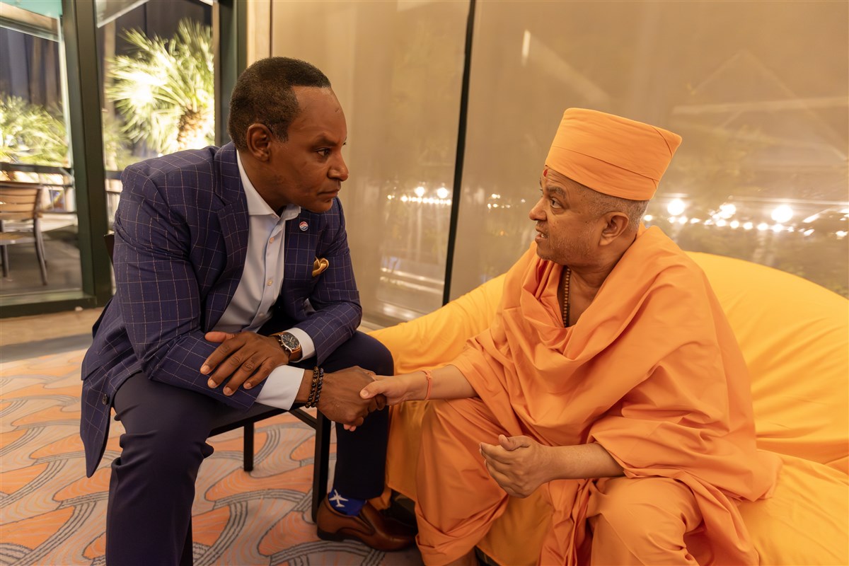 Following his talk, attendees, VIPs, and guests made their way to meet Pujya Brahmaviharidas Swami, drawn by the depth of his message, with many immediately wanting to visit the BAPS Hindu Mandir in Abu Dhabi.