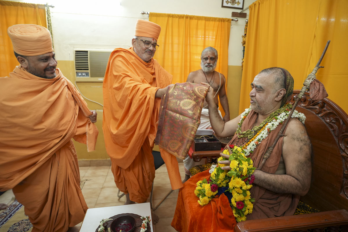 Bhadreshdas Swami honors Sri Sri Shankara Vijayendra Saraswathi Shankaracharya Swamigal with a shawl
