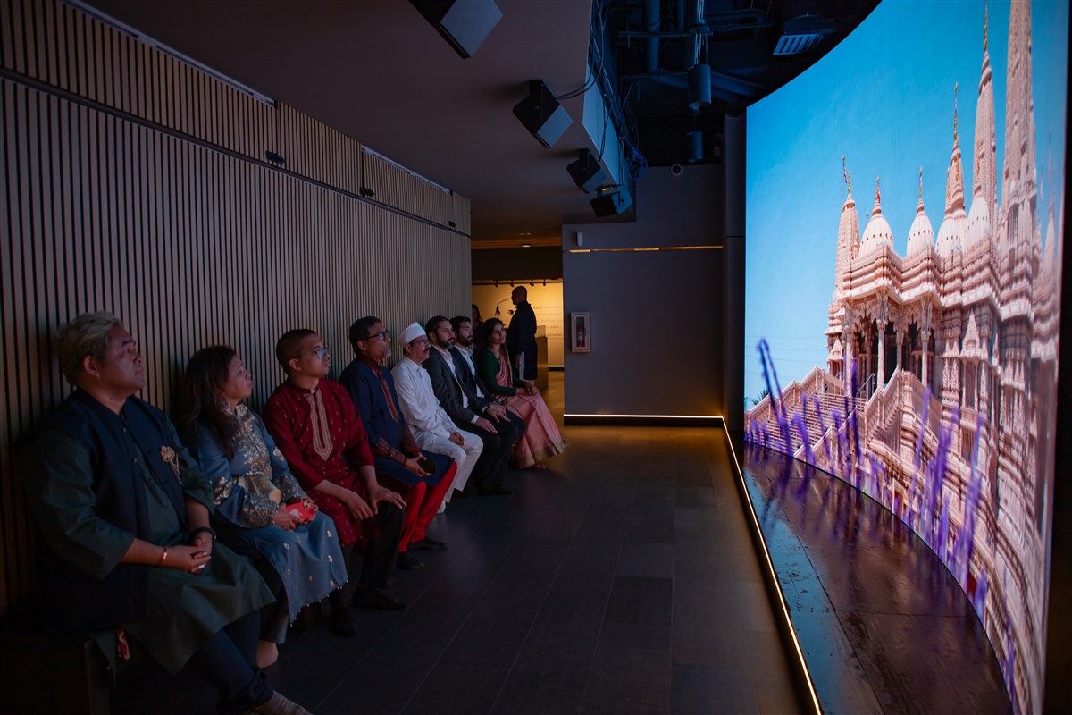 Attendees watch a brief history of the mandir and its impact at the theater in the Museum of Hindu Architecture