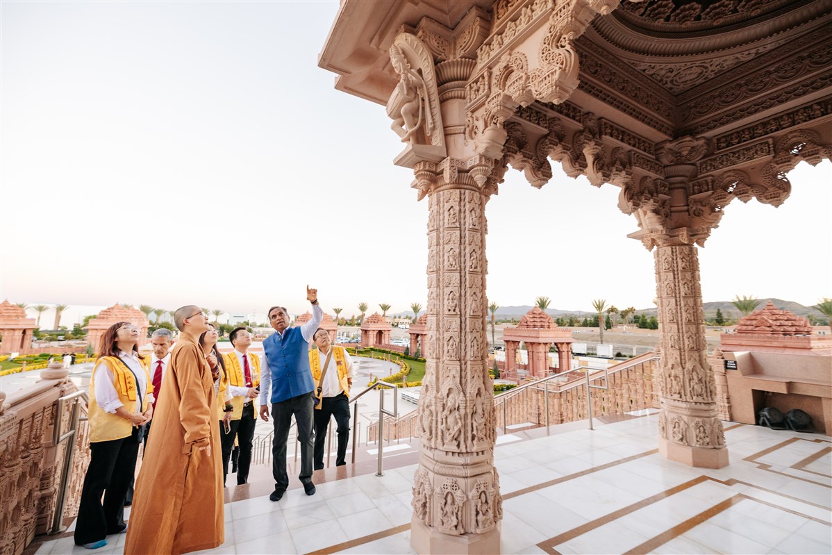During the tour, a BAPS volunteer explains the significance of the carvings to leaders of the Fo Guang Shan Hsi Lai Temple