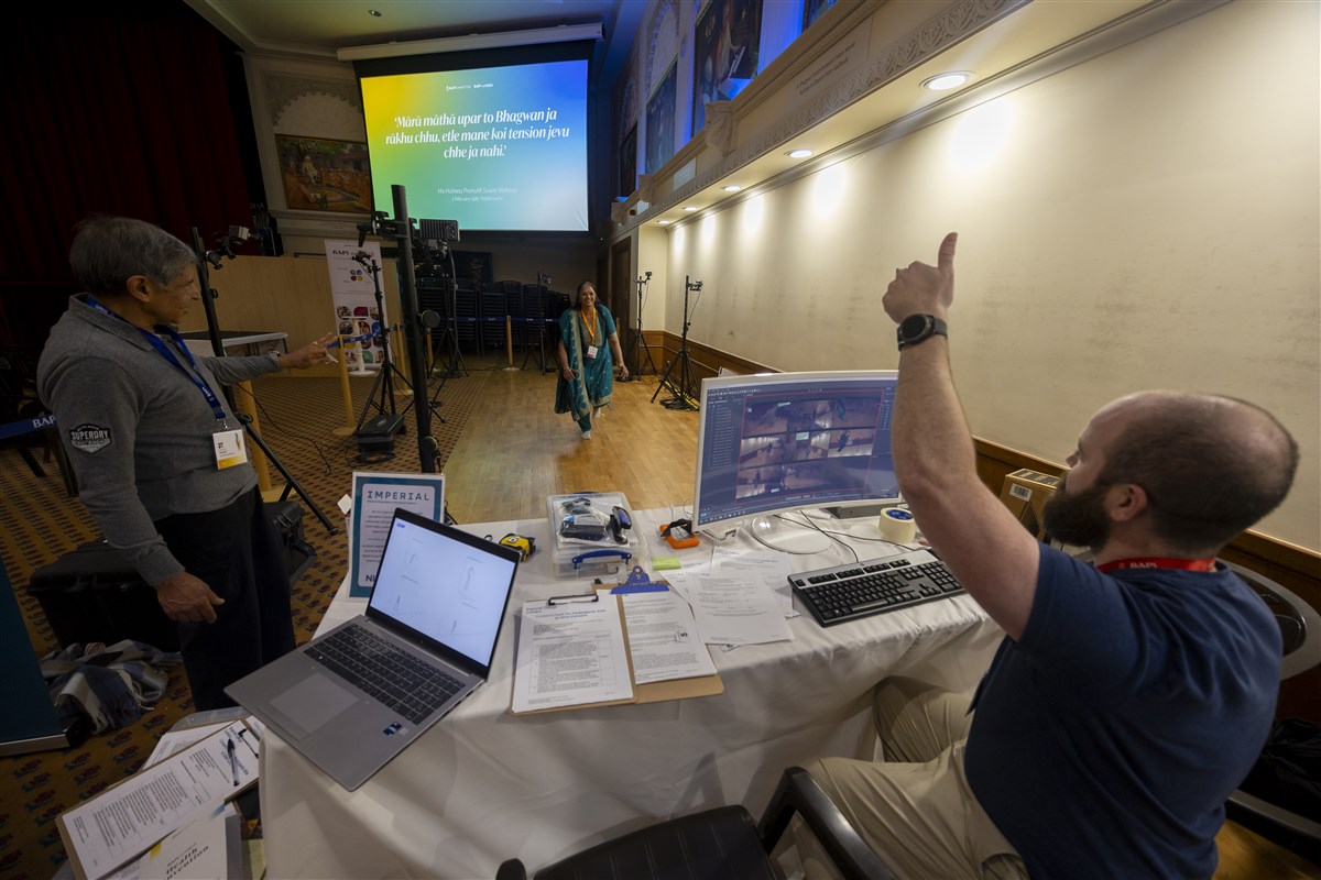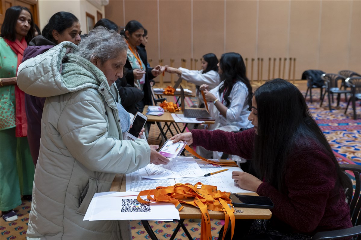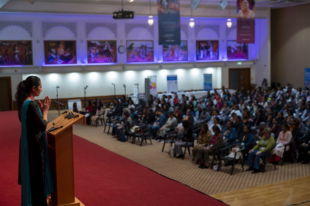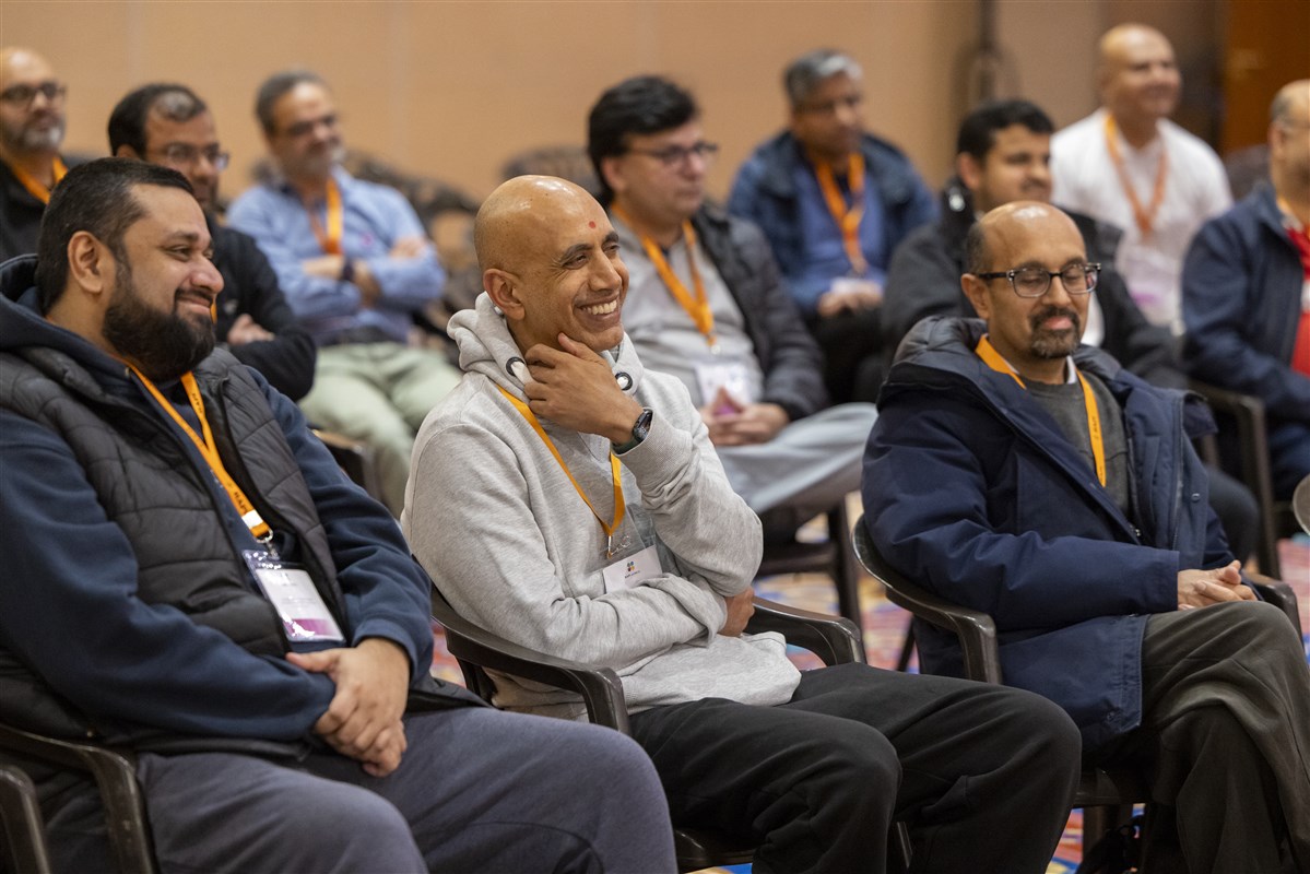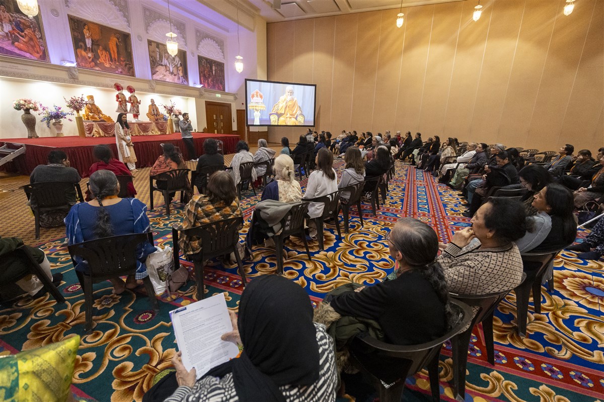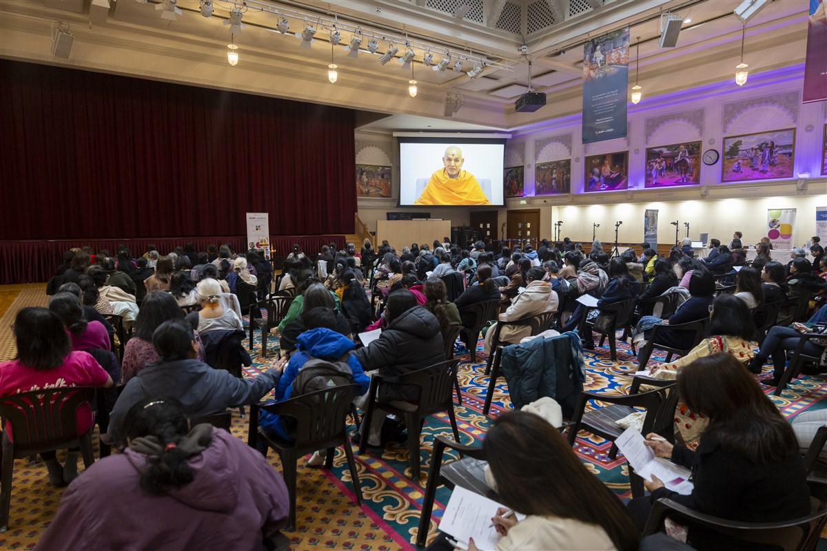Delegates viewed a video message of blessings and inspiration from His Holiness Mahant Swami Maharaj during the opening session of the convention.