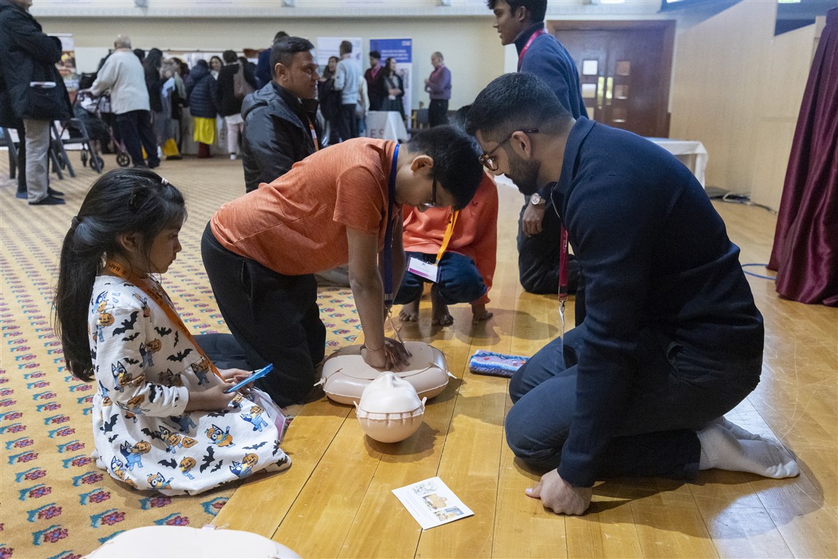 A healthcare professional explained life-saving techniques to children and adults during the resuscitation workshop.