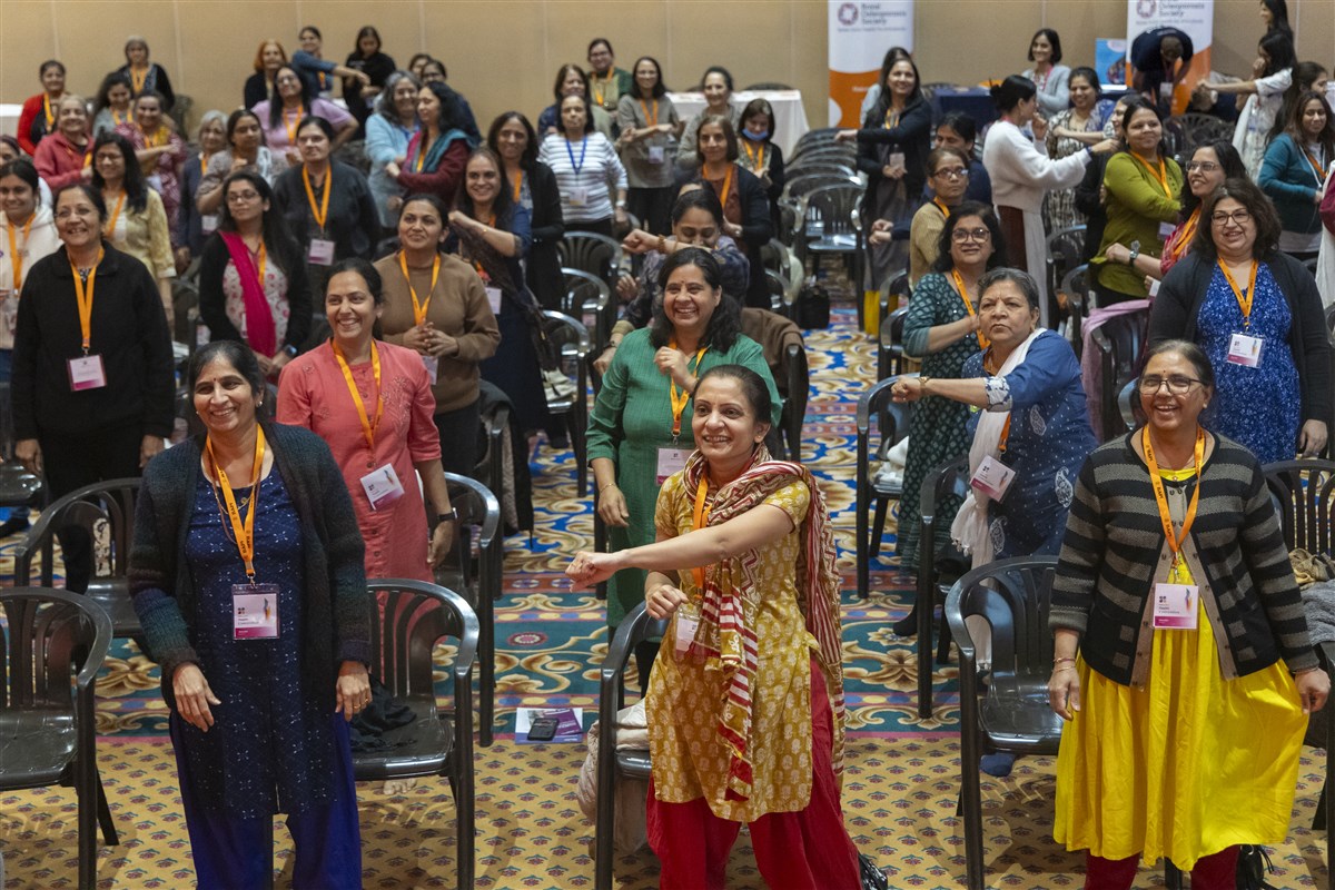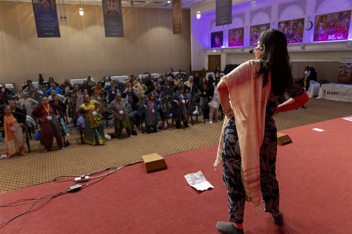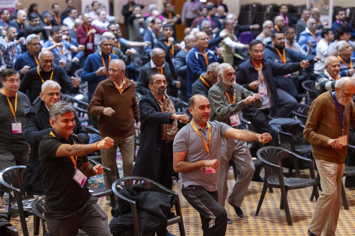 Delegates participated in a guided exercise session, practising coordinated movements during the interactive workshop.
